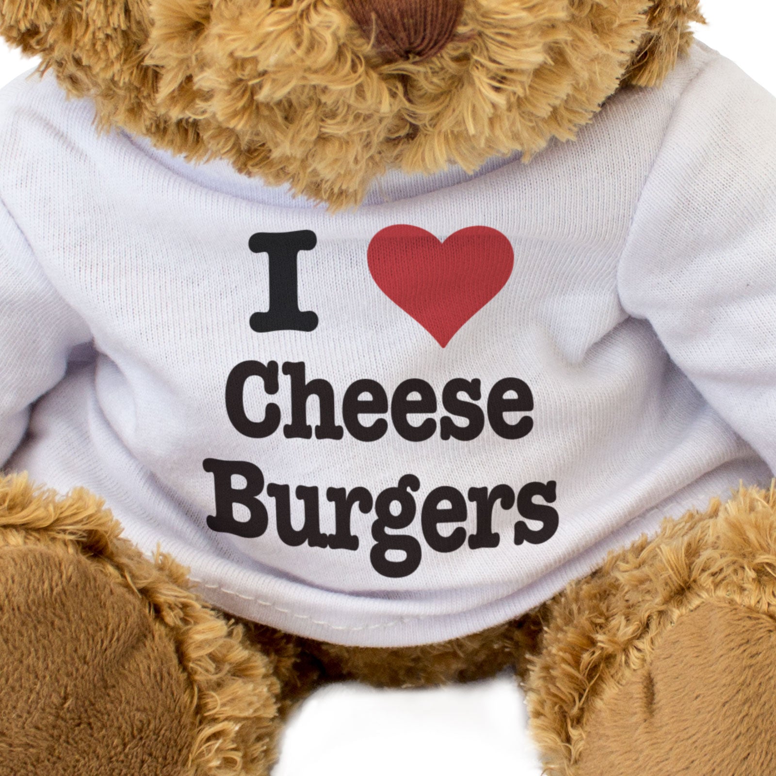Our bear wears a white t-shirt with I Love Cheese Burgers printed on it in full colour. This teddy bear makes a thoughtful and personal gift for friends and family.