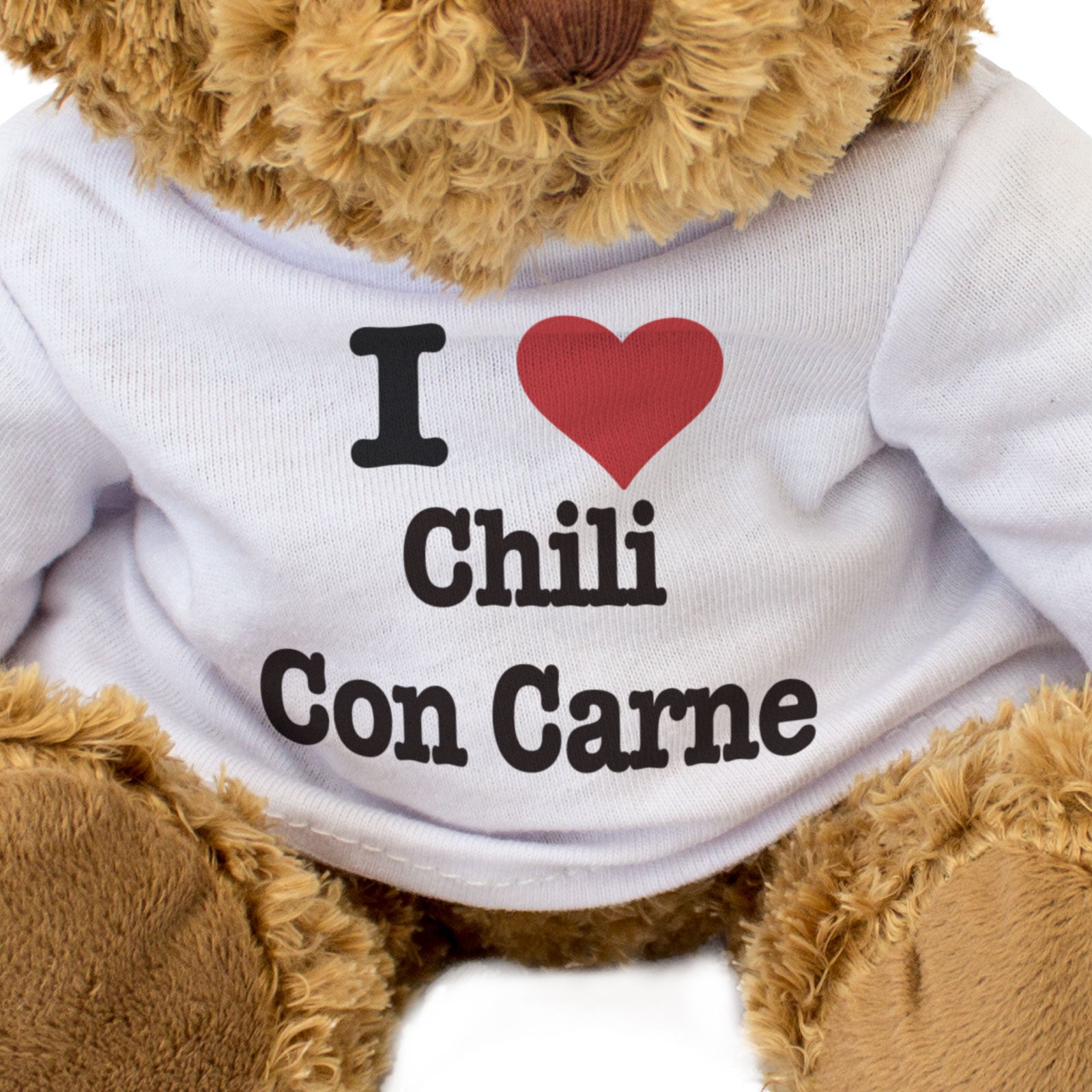 Our bear wears a white t-shirt with I Love Chili Con Carne printed on it in full colour. This teddy bear makes a thoughtful and personal gift for friends and family.
