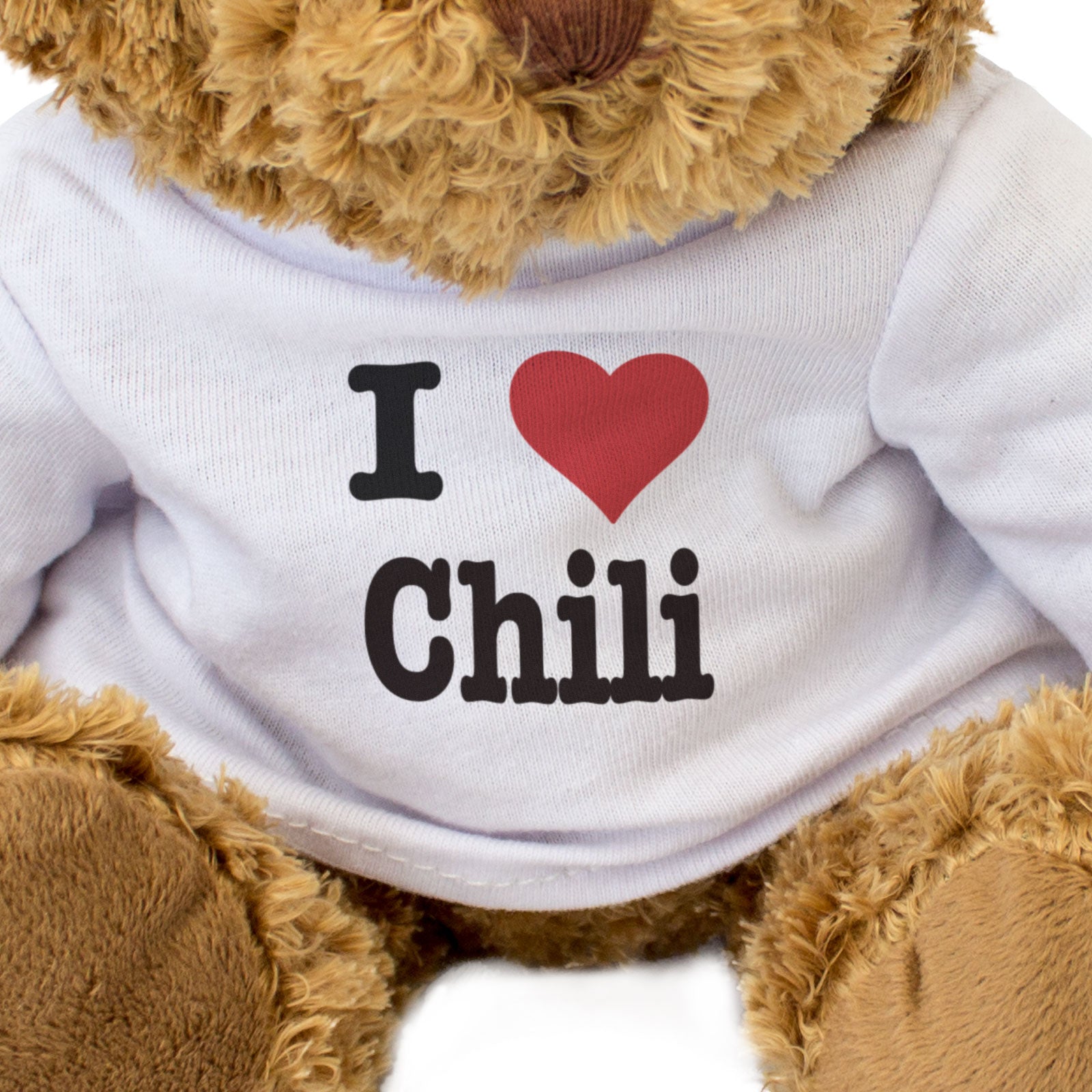 Our bear wears a white t-shirt with I Love Chili printed on it in full colour. This teddy bear makes a thoughtful and personal gift for friends and family.