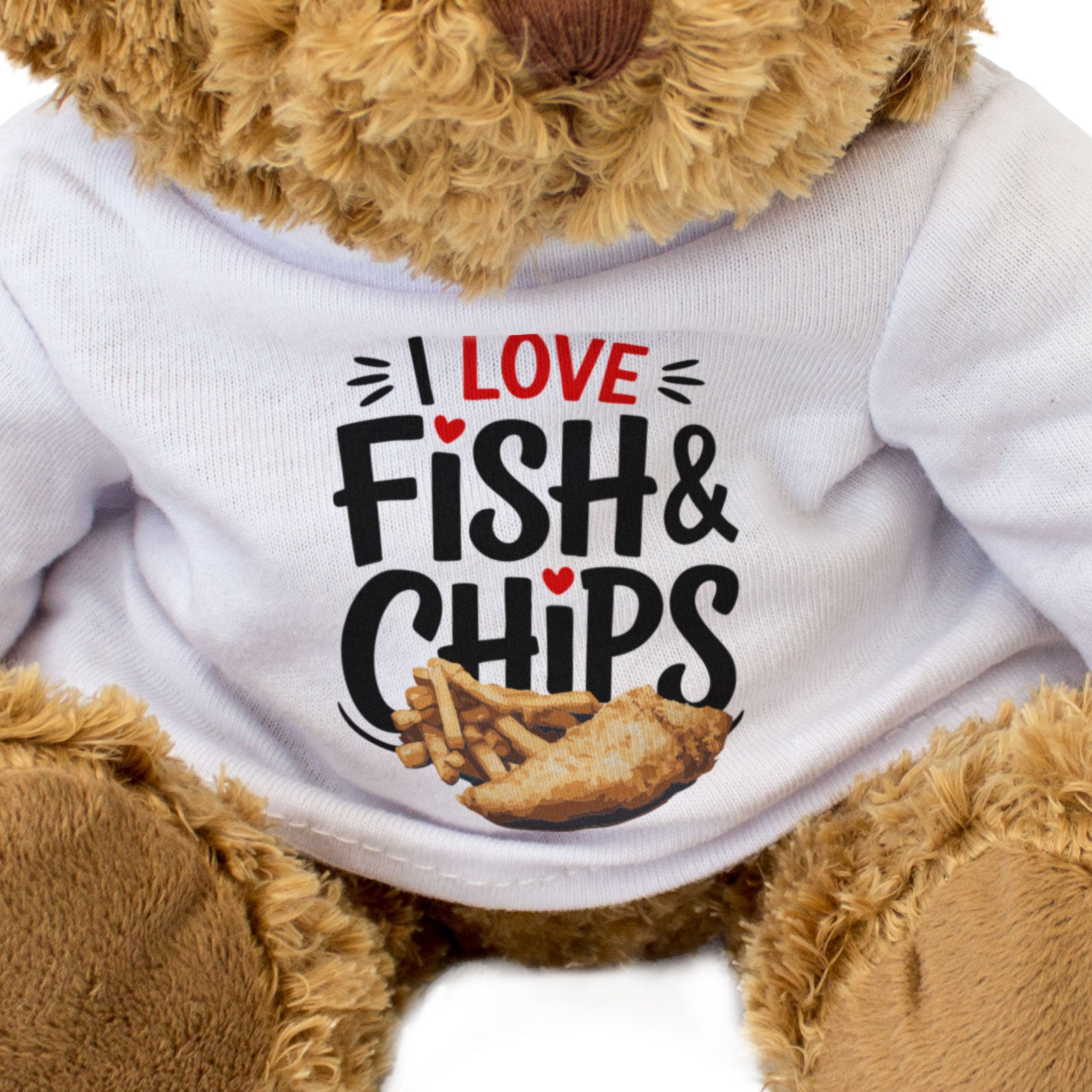Our bear wears a white t-shirt with I Love Fish & Chips printed on it in full colour. This teddy bear makes a thoughtful and personal gift for friends and family.