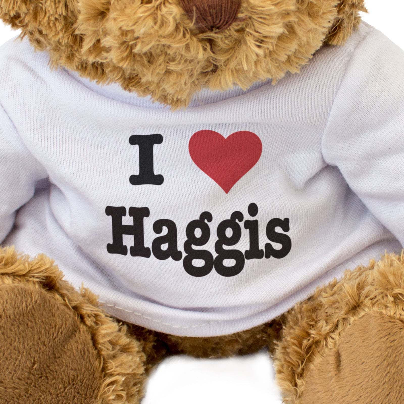 Our bear wears a white t-shirt with I Love Haggis printed on it in full colour. This teddy bear makes a thoughtful and personal gift for friends and family.
