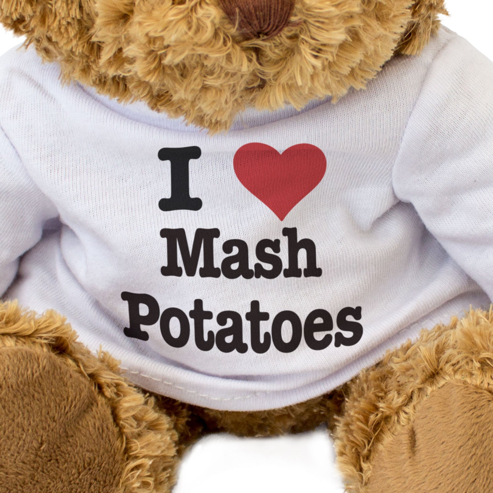 Our bear wears a white t-shirt with I Love Mash Potatoes printed on it in full colour. This teddy bear makes a thoughtful and personal gift for friends and family.