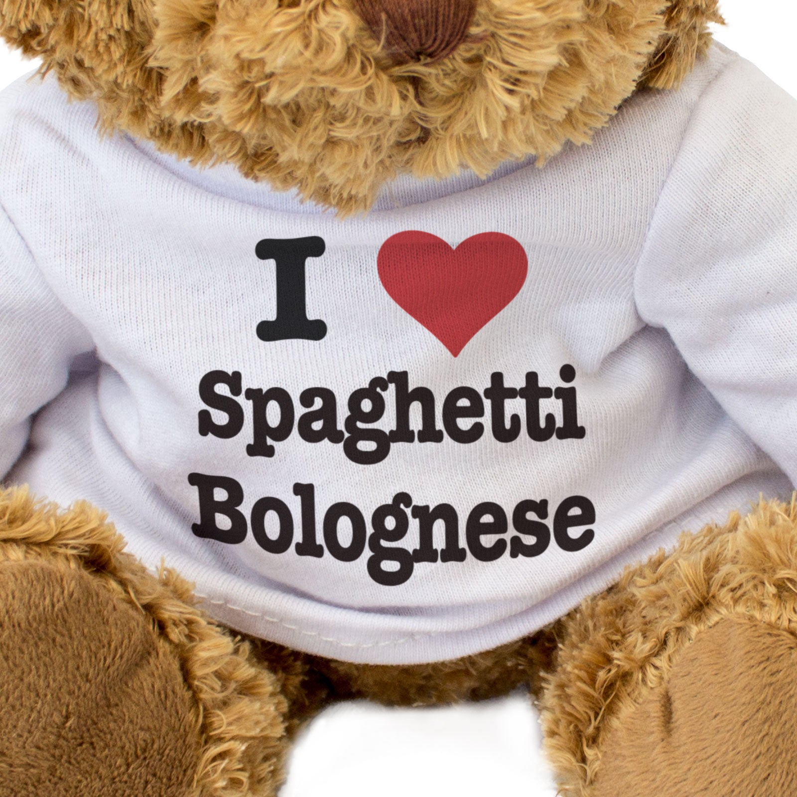 Our bear wears a white t-shirt with I Love Spaghetti Bolognese printed on it in full colour. This teddy bear makes a thoughtful and personal gift for friends and family.