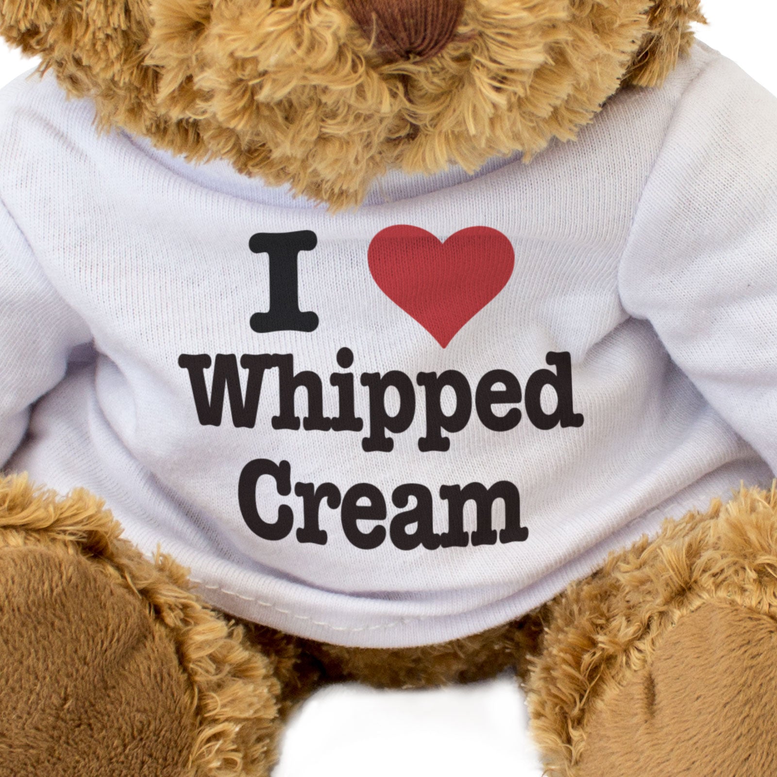 Our bear wears a white t-shirt with I Love Whipped Cream printed on it in full colour. This teddy bear makes a thoughtful and personal gift for friends and family.