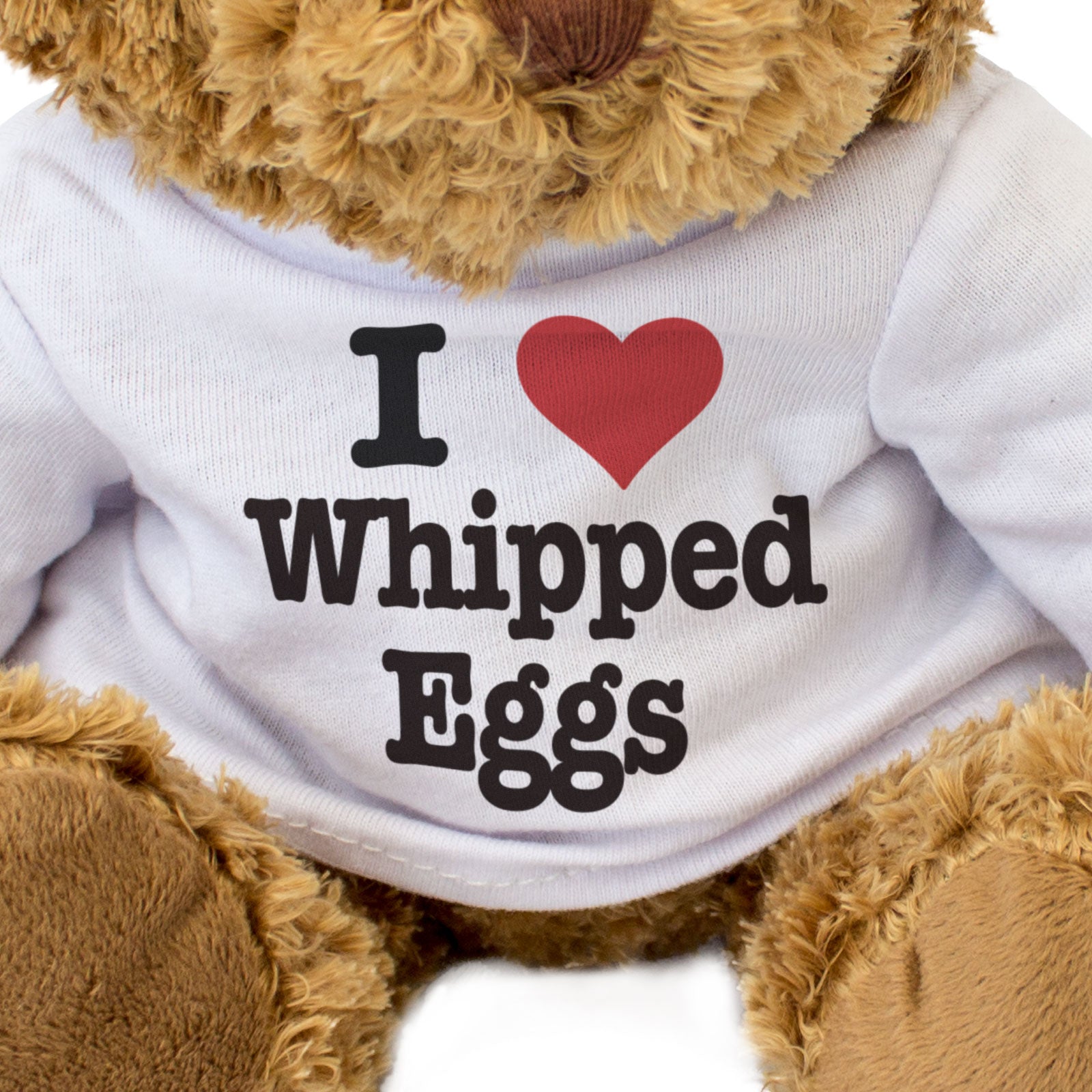 Our bear wears a white t-shirt with I Love Whipped Eggs printed on it in full colour. This teddy bear makes a thoughtful and personal gift for friends and family.