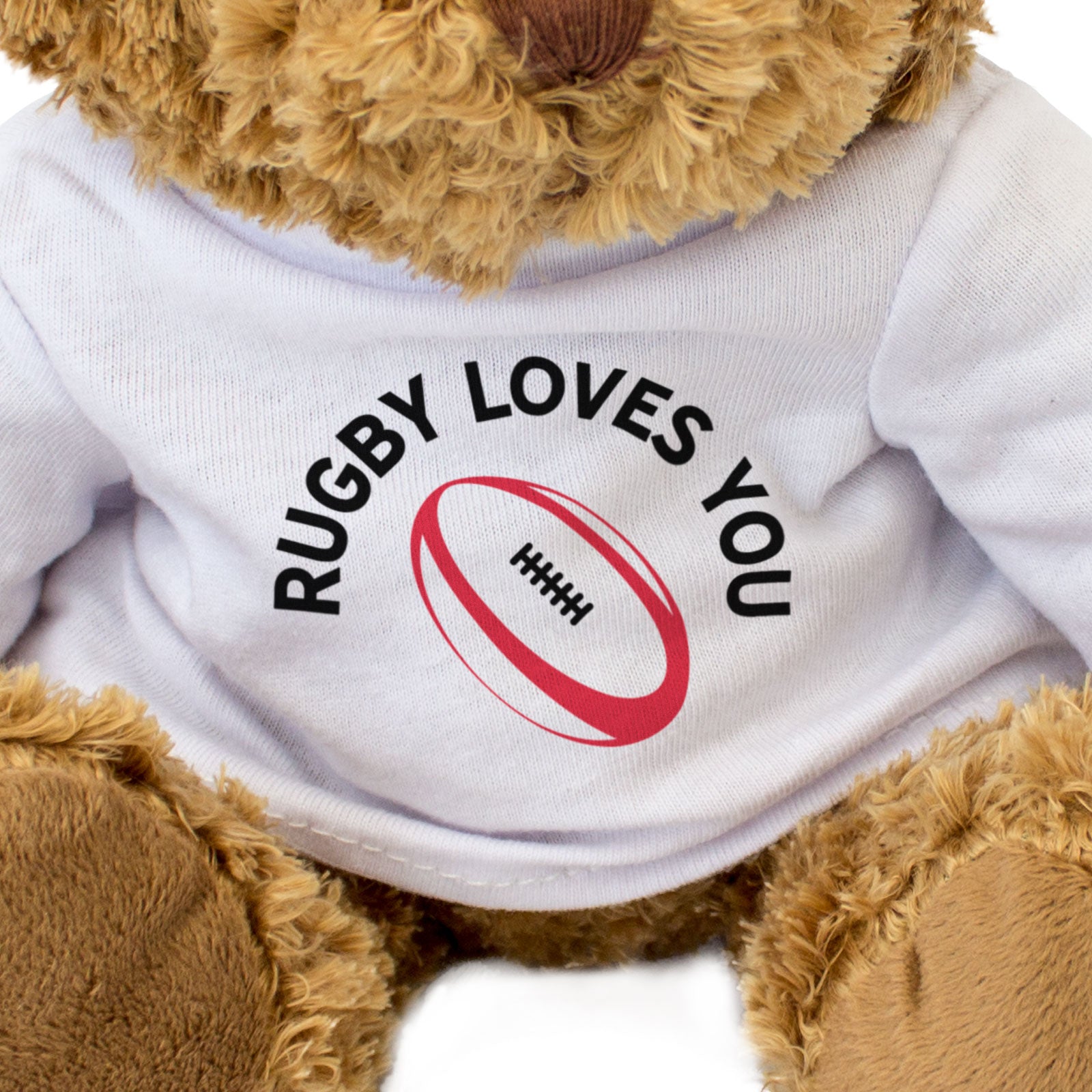 This teddy bear wears a white t-shirt with RUGBY LOVES YOU printed on it.