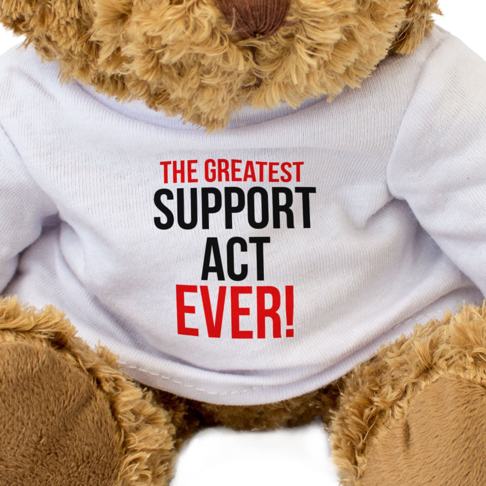 Our bear wears a white t-shirt with the The Greatest Support Act Ever printed on it in full colour. This teddy bear makes a thoughtful and personal gift for friends and family.