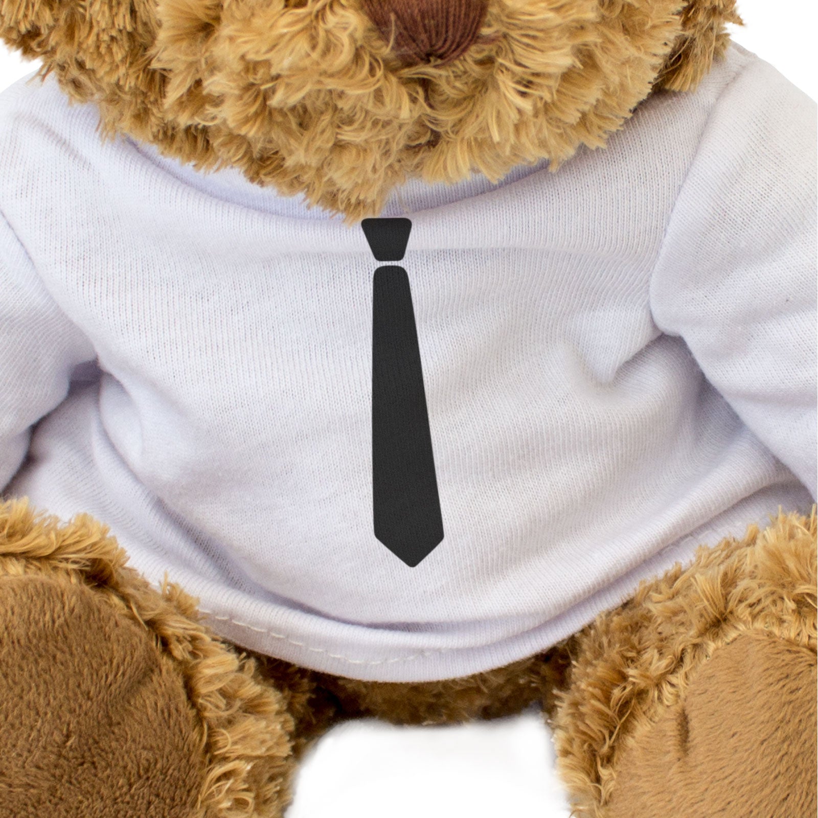 This teddy bear wears a white t-shirt with Black Tie printed on it.