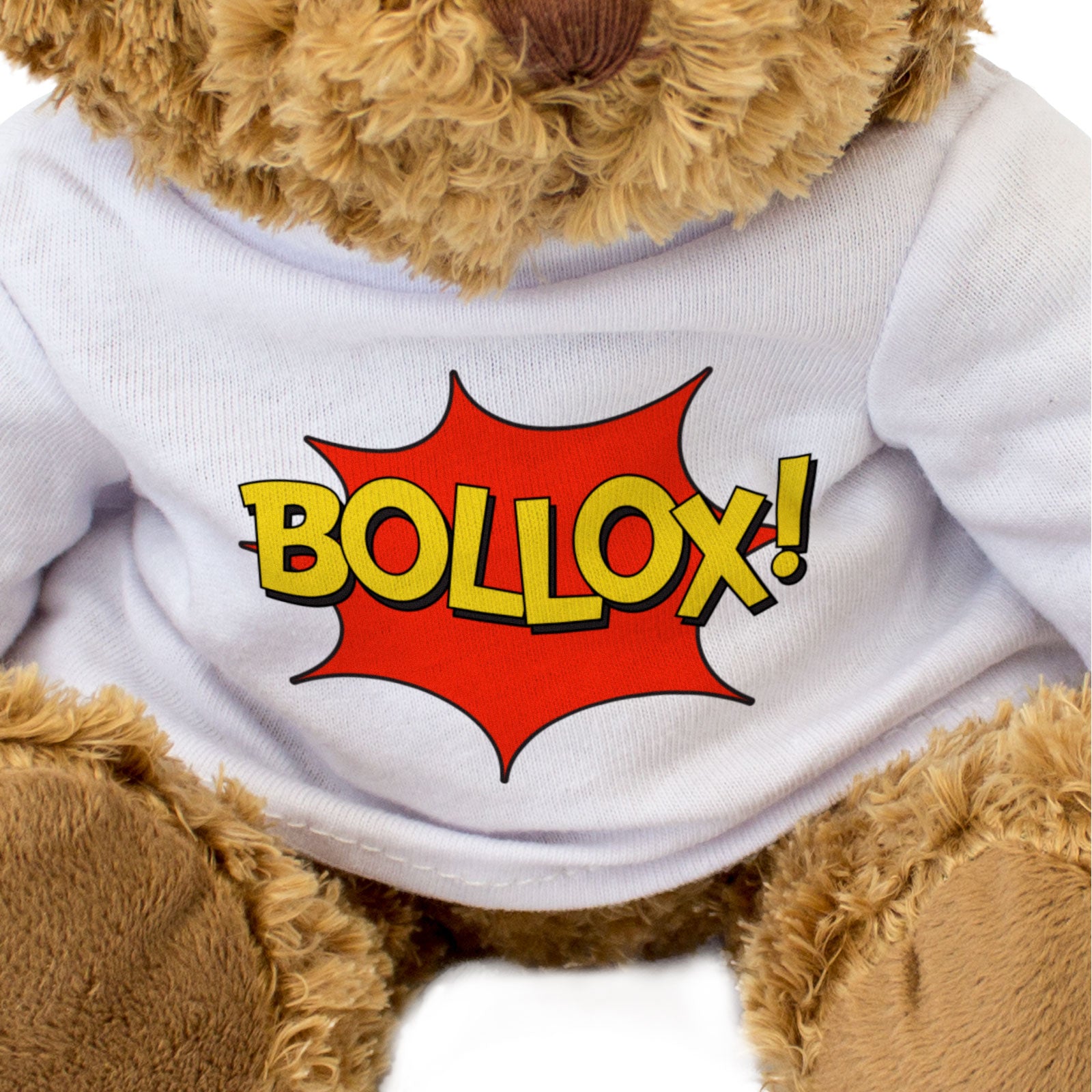 This teddy bear wears a white t-shirt with Bollox printed on it.