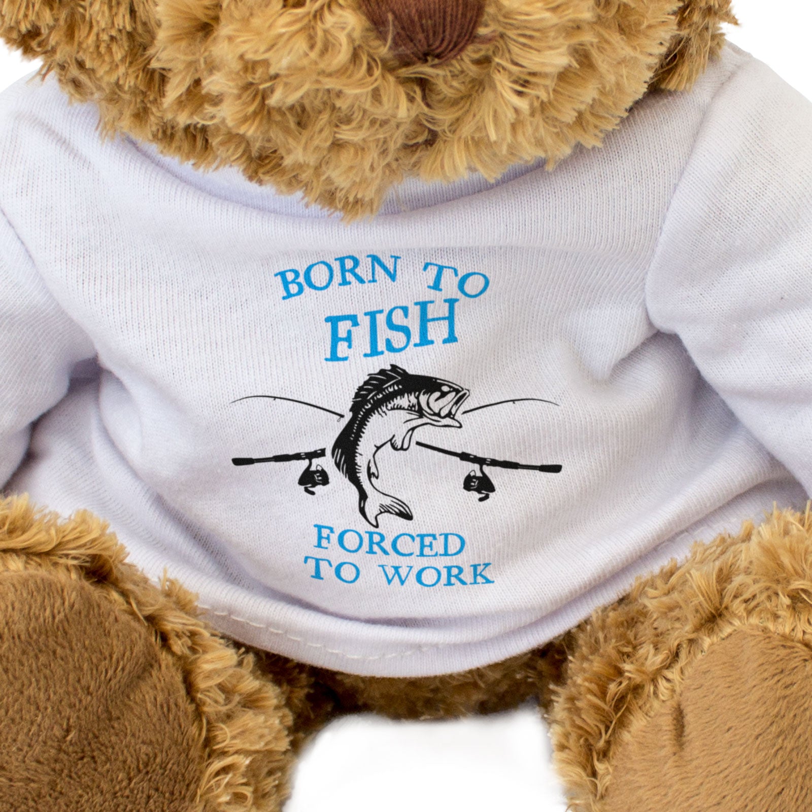 Our bear wears a white t-shirt with Born To Fish Forced To Work printed on it in full colour. This teddy bear makes a thoughtful and personal gift for friends and family.