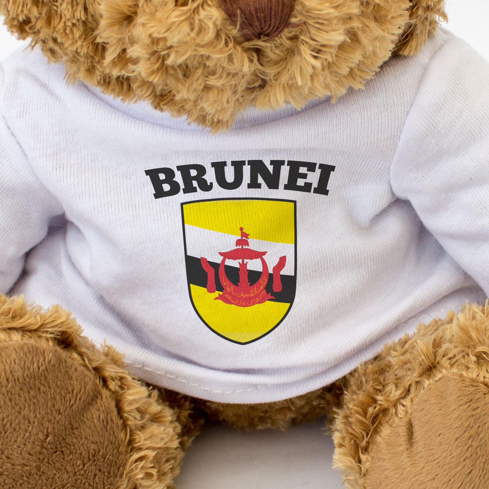 Our bear wears a white t-shirt with the flag of Brunei printed on it in full colour. This bear makes a thoughtful and personal gift for friends and family.