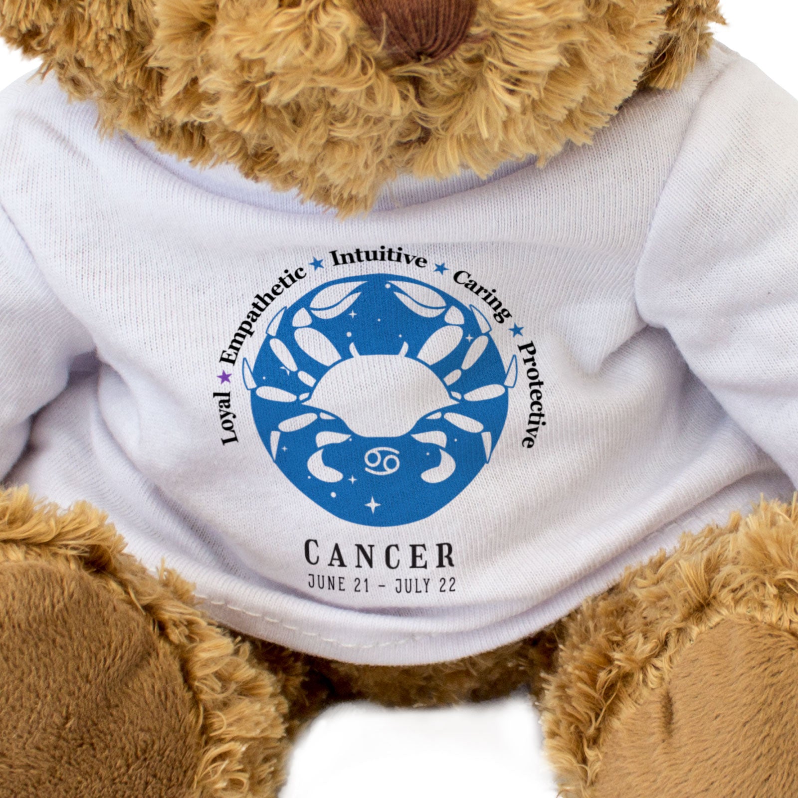 Our bear wears a white t-shirt with Cancer printed on it in full colour. This teddy bear makes a thoughtful and personal gift for friends and family.