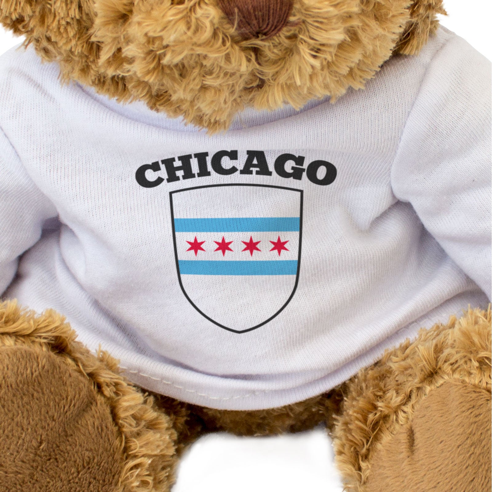 Our bear wears a white t-shirt with the flag of Chicago printed on it in full colour. This bear makes a thoughtful and personal gift for friends and family.