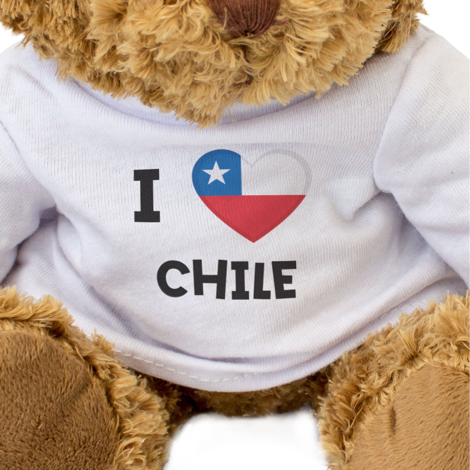 Our bear wears a white t-shirt with I Love Chile Flag printed on it in full colour. This teddy bear makes a thoughtful and personal gift for friends and family.
