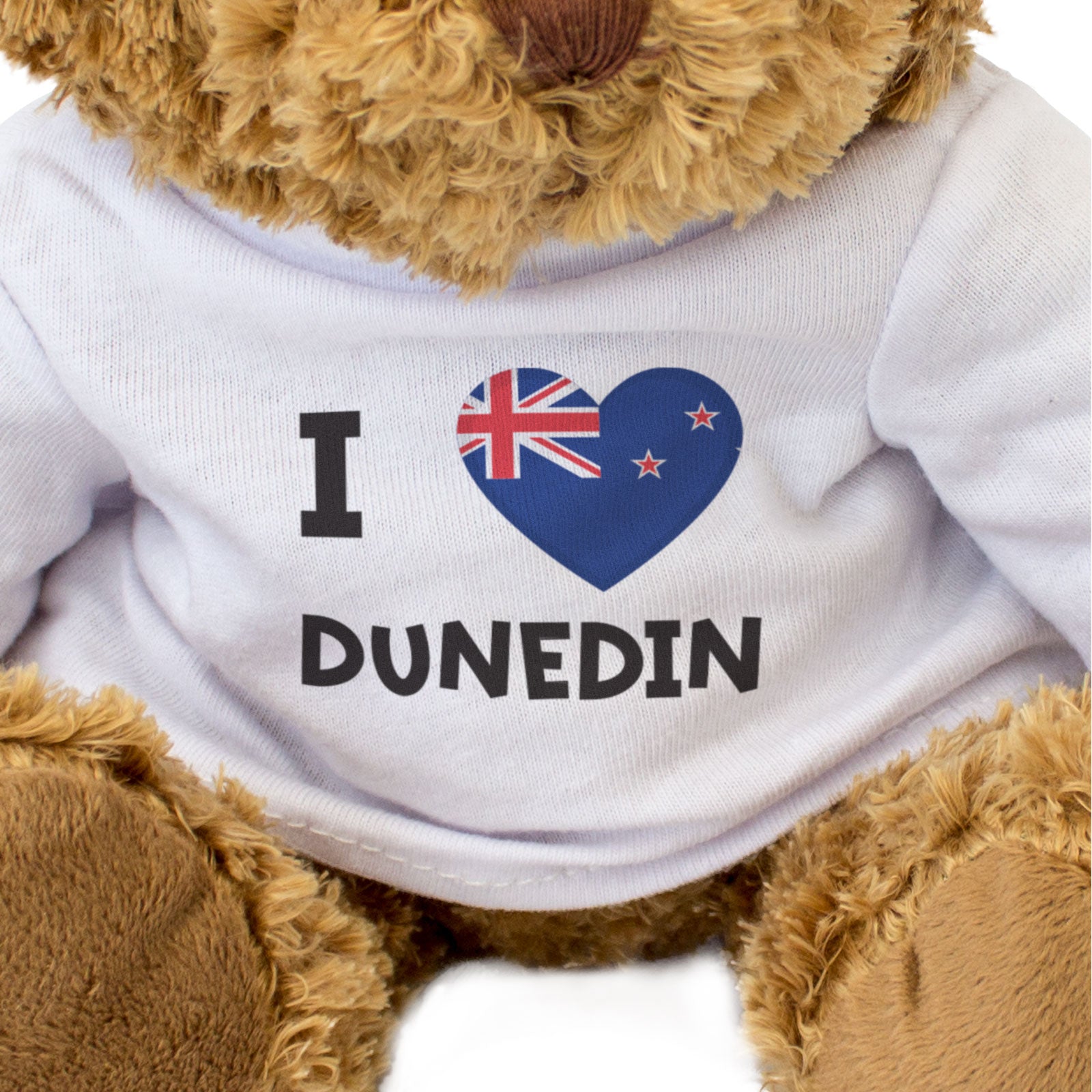 Our bear wears a white t-shirt with I Love Dunedin printed on it in full colour. This teddy bear makes a thoughtful and personal gift for friends and family.