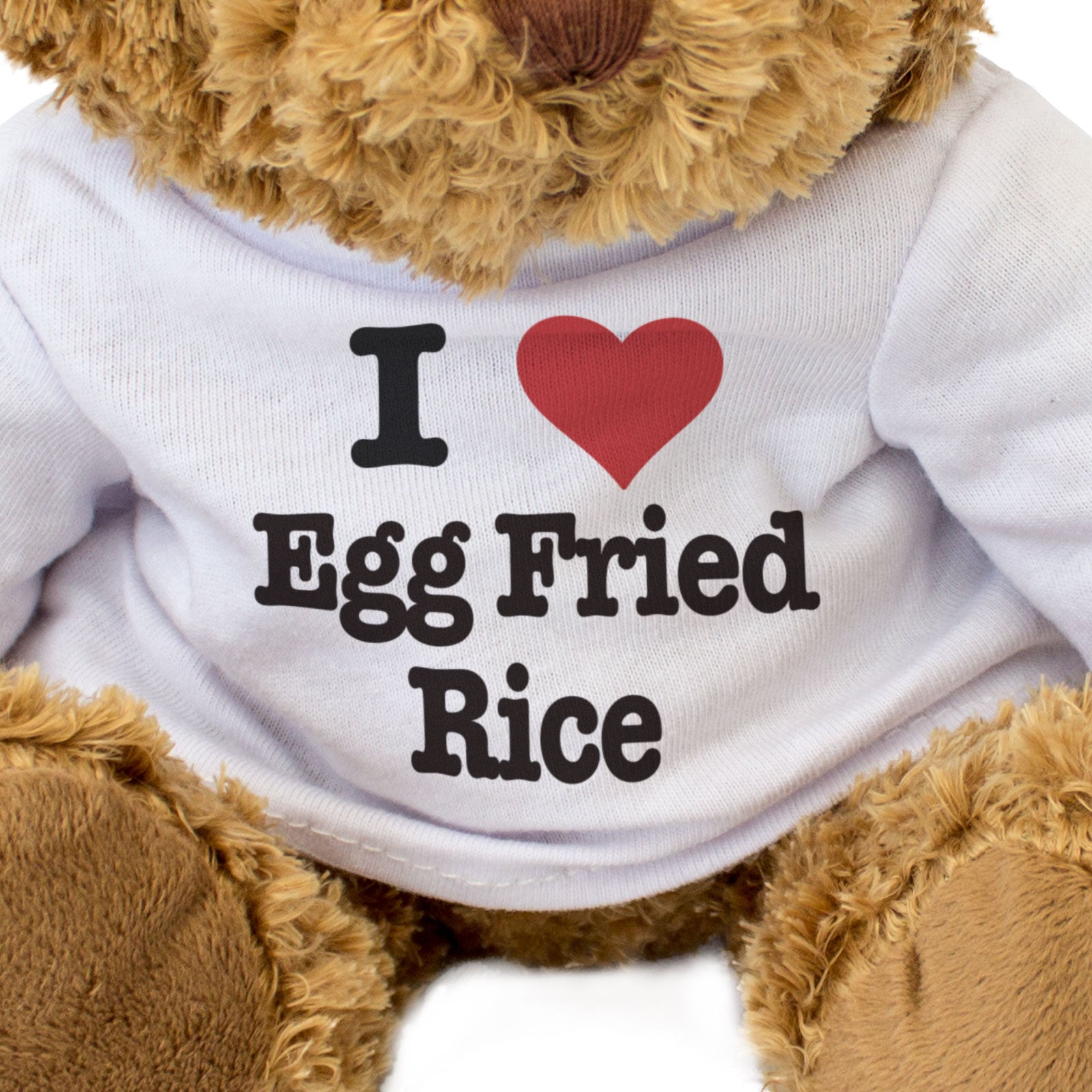 Our bear wears a white t-shirt with I Love Egg Fried Rice printed on it in full colour. This teddy bear makes a thoughtful and personal gift for friends and family.