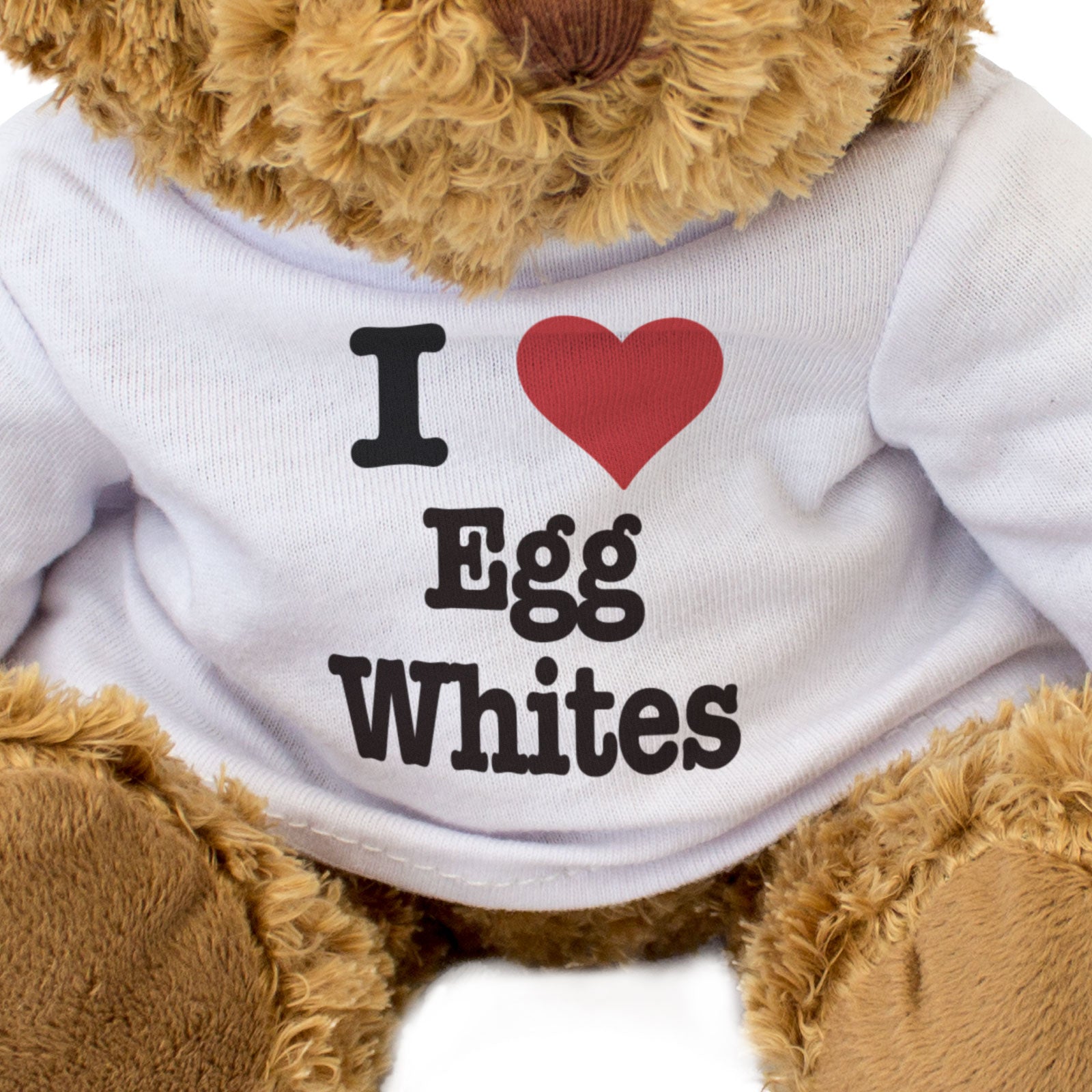 Our bear wears a white t-shirt with I Love Egg Whites printed on it in full colour. This teddy bear makes a thoughtful and personal gift for friends and family.