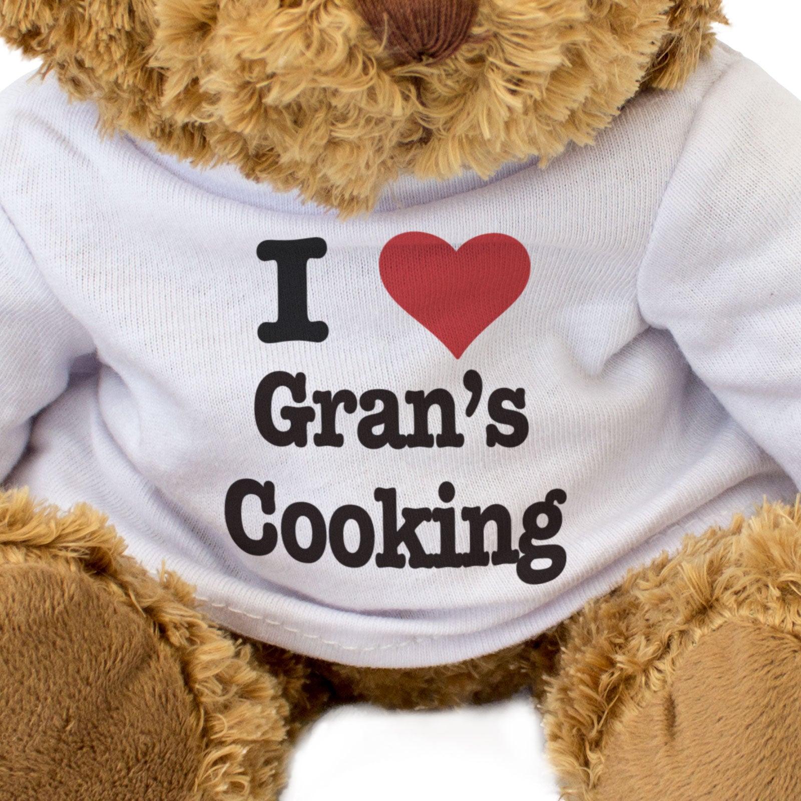 Our bear wears a white t-shirt with I Love Gran's Cooking printed on it in full colour. This teddy bear makes a thoughtful and personal gift for friends and family.