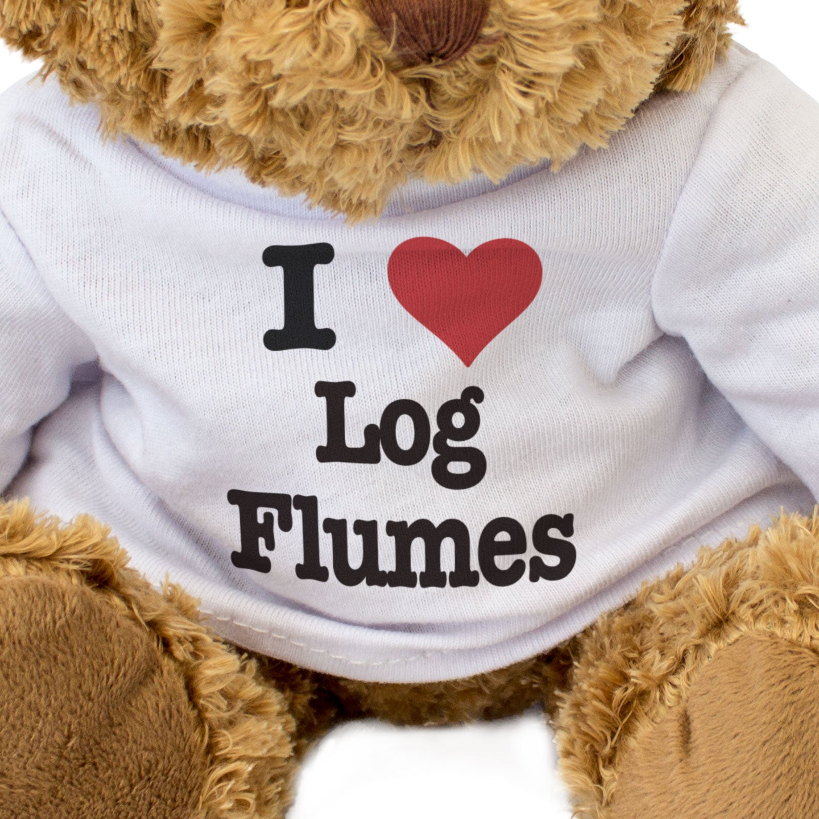 Our bear wears a white t-shirt with I Love Log Flumes printed on it in full colour. This teddy bear makes a thoughtful and personal gift for friends and family.