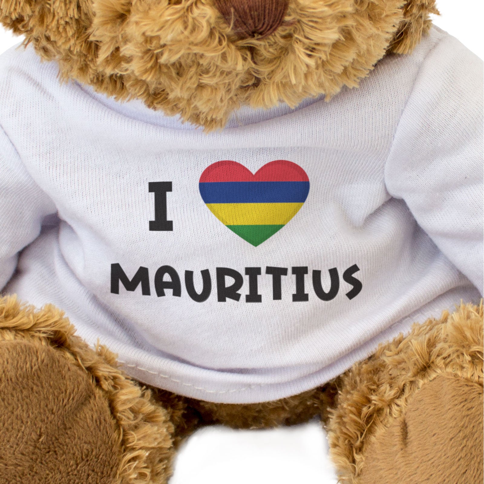Our bear wears a white t-shirt with I Love Mauritius printed on it in full colour. This teddy bear makes a thoughtful and personal gift for friends and family.