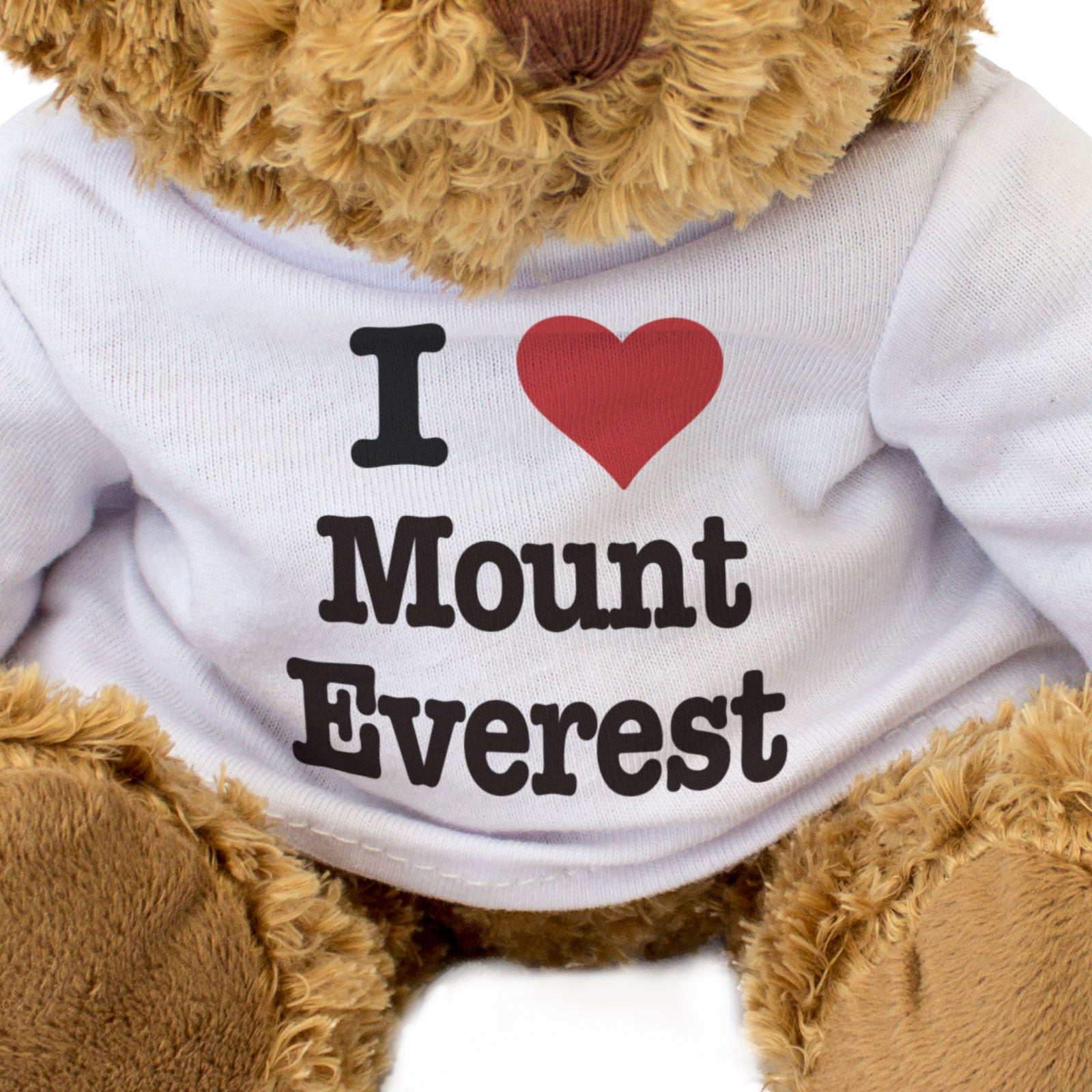 Our bear wears a white t-shirt with I Love Mount Everest printed on it in full colour. This teddy bear makes a thoughtful and personal gift for friends and family.
