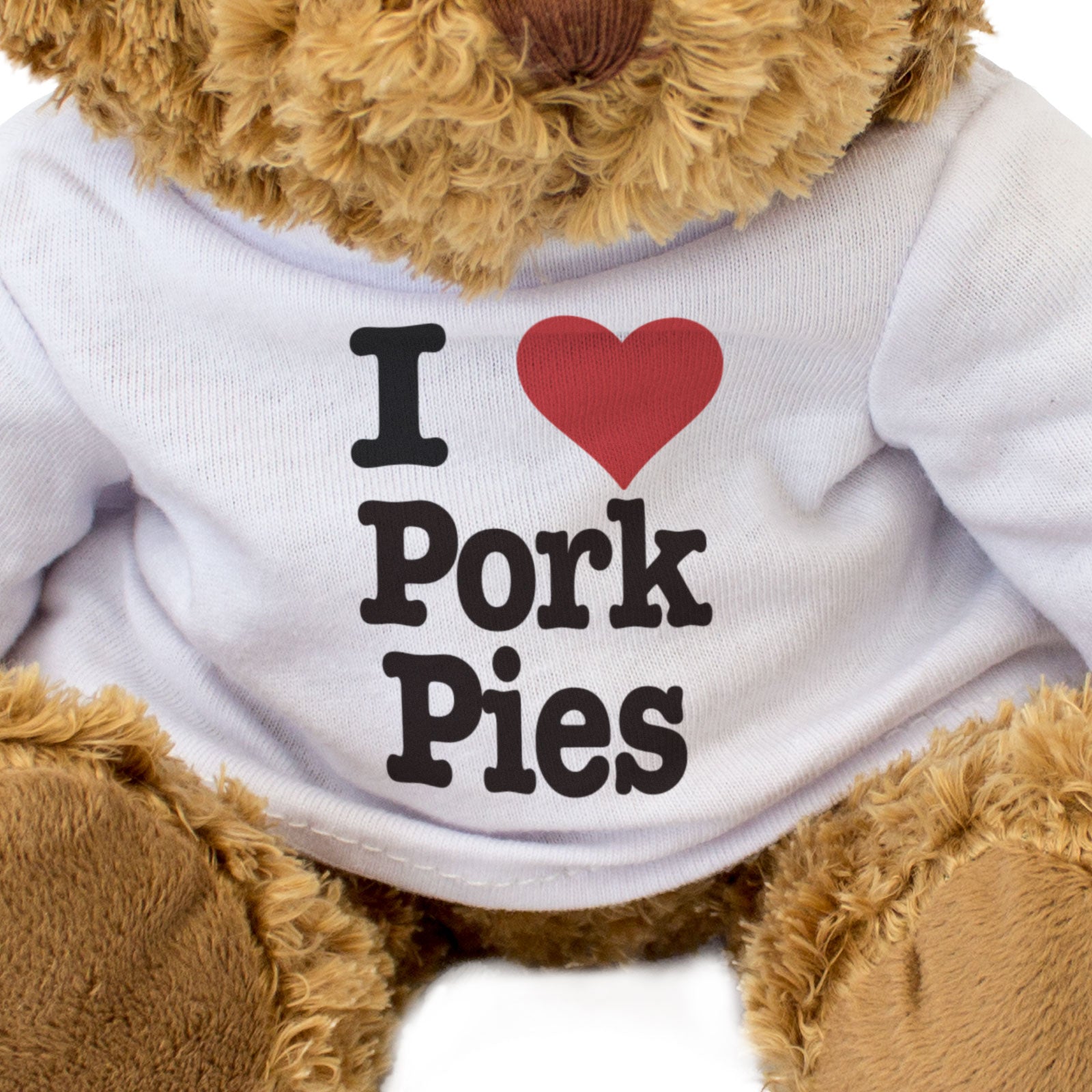 This teddy bear wears a white t-shirt with I Love Pork Pies printed on it.