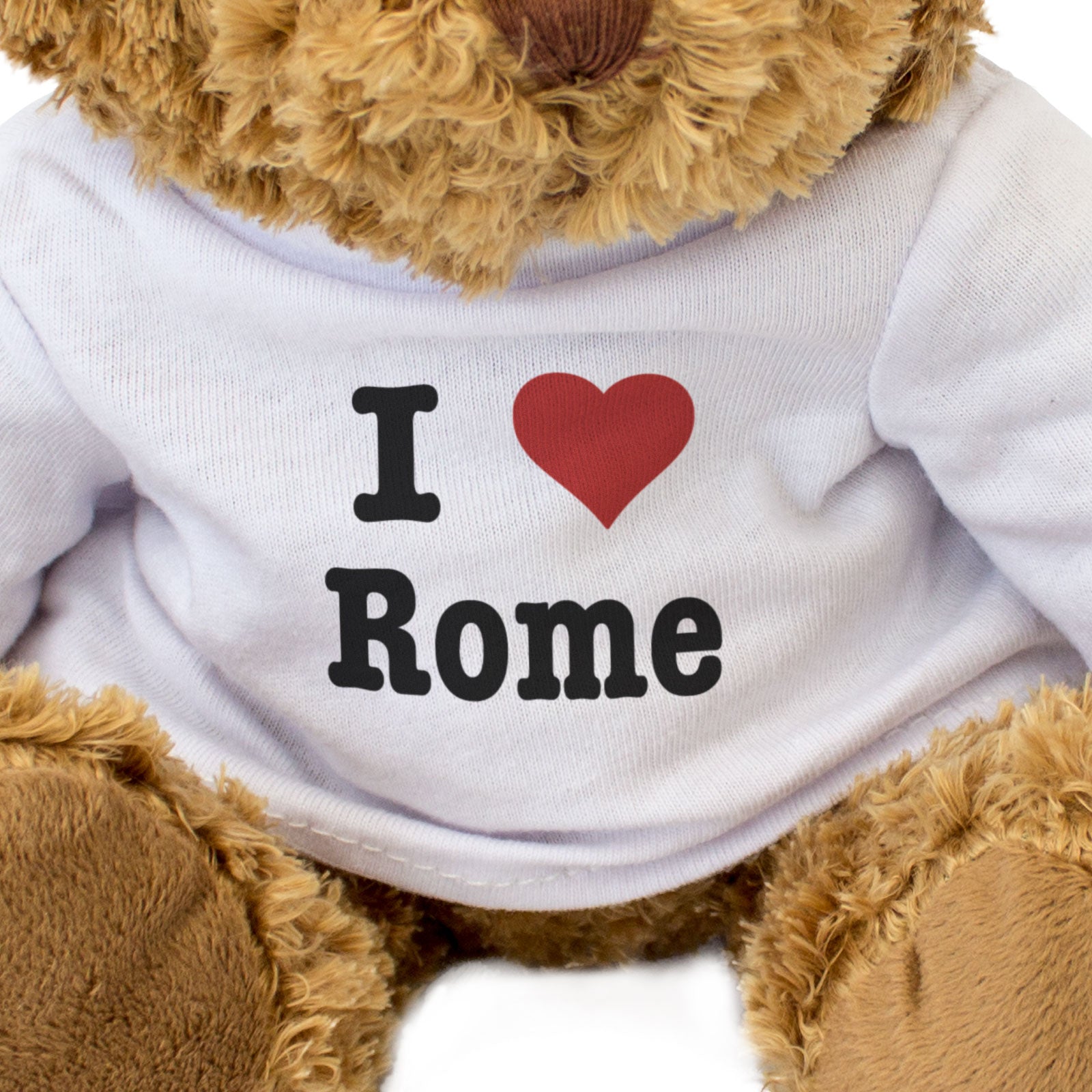 Our bear wears a white t-shirt with I LOVE ROME printed on it.