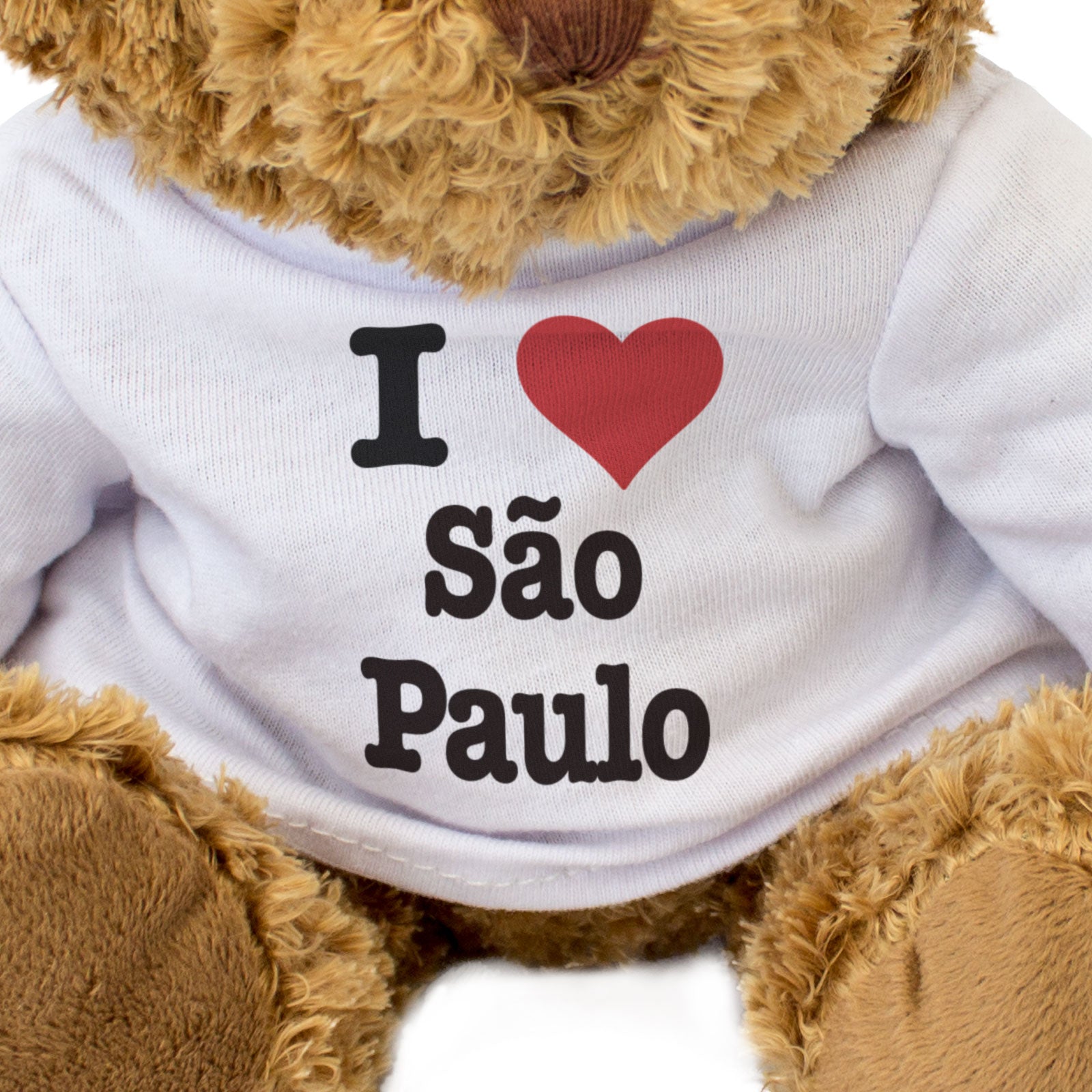 Our bear wears a white t-shirt with I Love São Paulo printed on it in full colour. This teddy bear makes a thoughtful and personal gift for friends and family.