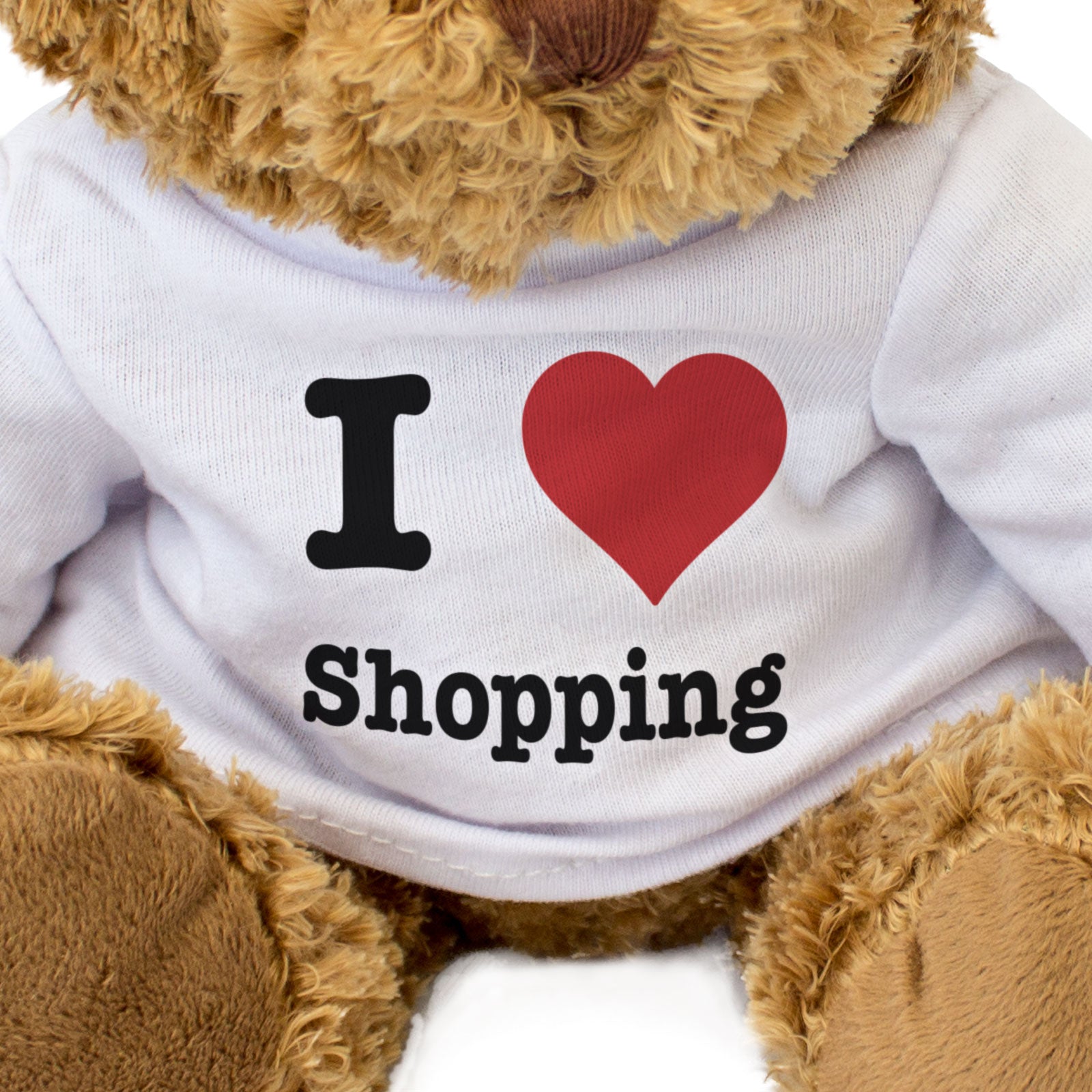 This teddy bear wears a white t-shirt with I Love Shopping printed on it.