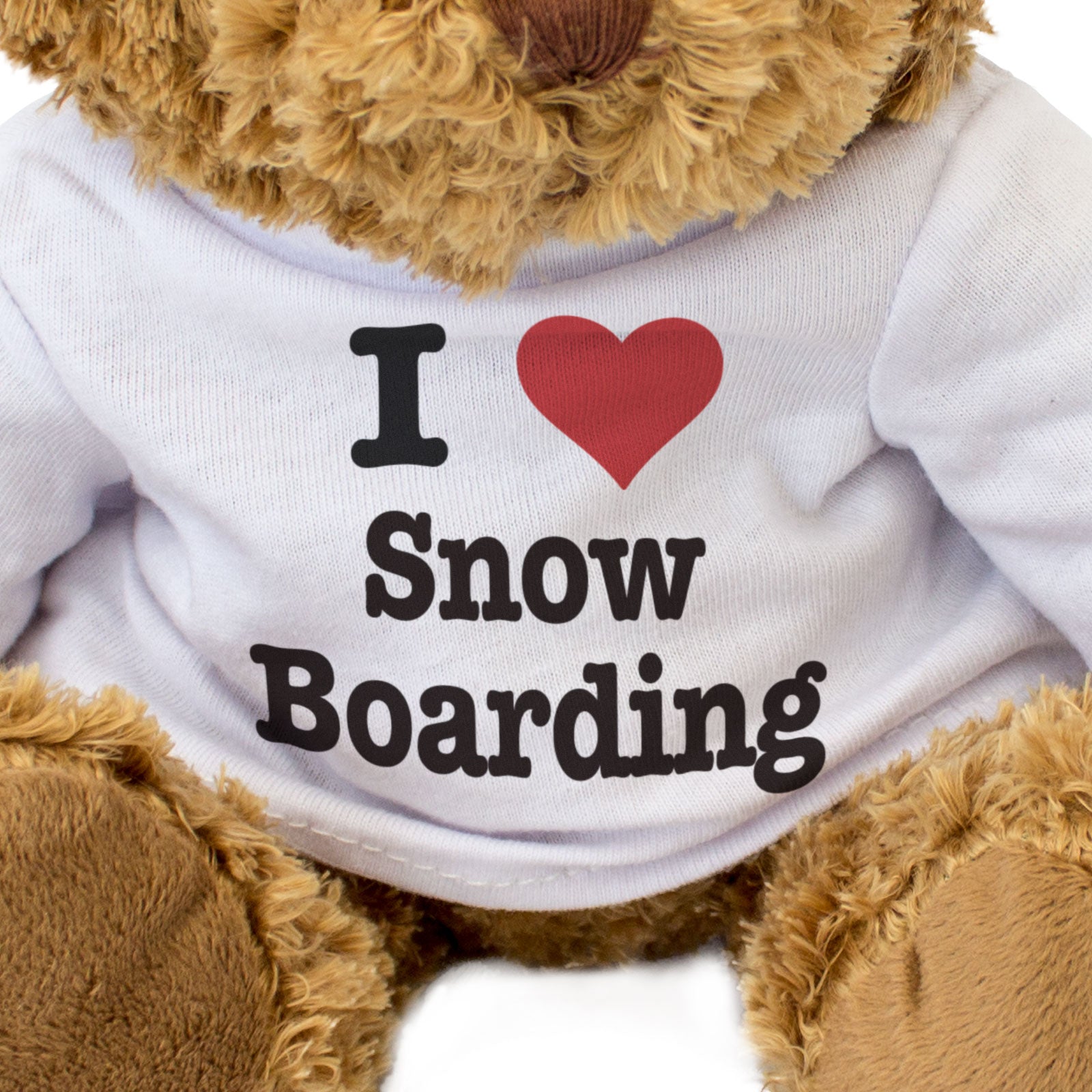 This teddy bear wears a white t-shirt with I Love Snowboarding printed on it.