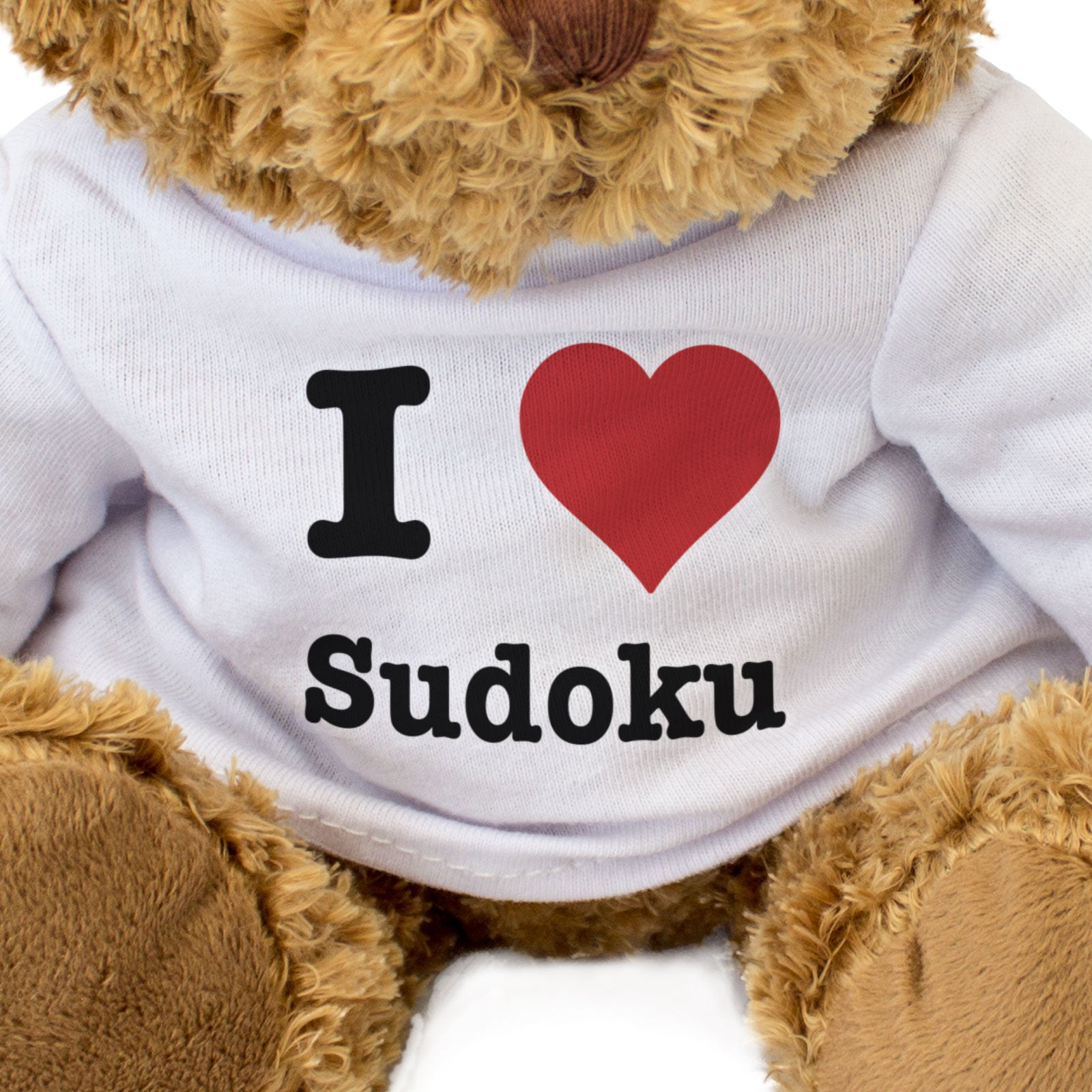 This teddy bear wears a white t-shirt with I Love Sudoku printed on it.