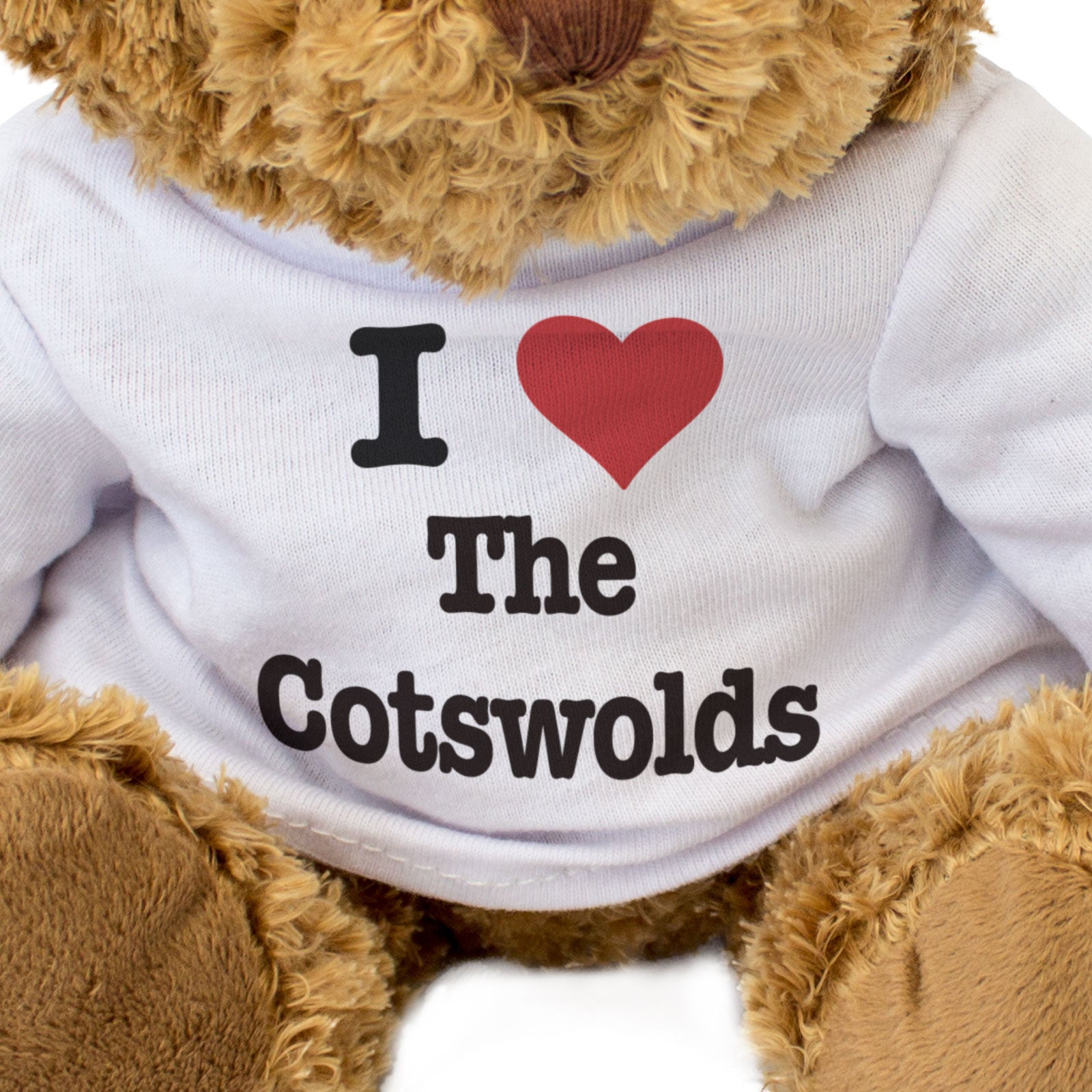 Our bear wears a white t-shirt with I Love The Cotswolds printed on it in full colour. This teddy bear makes a thoughtful and personal gift for friends and family.