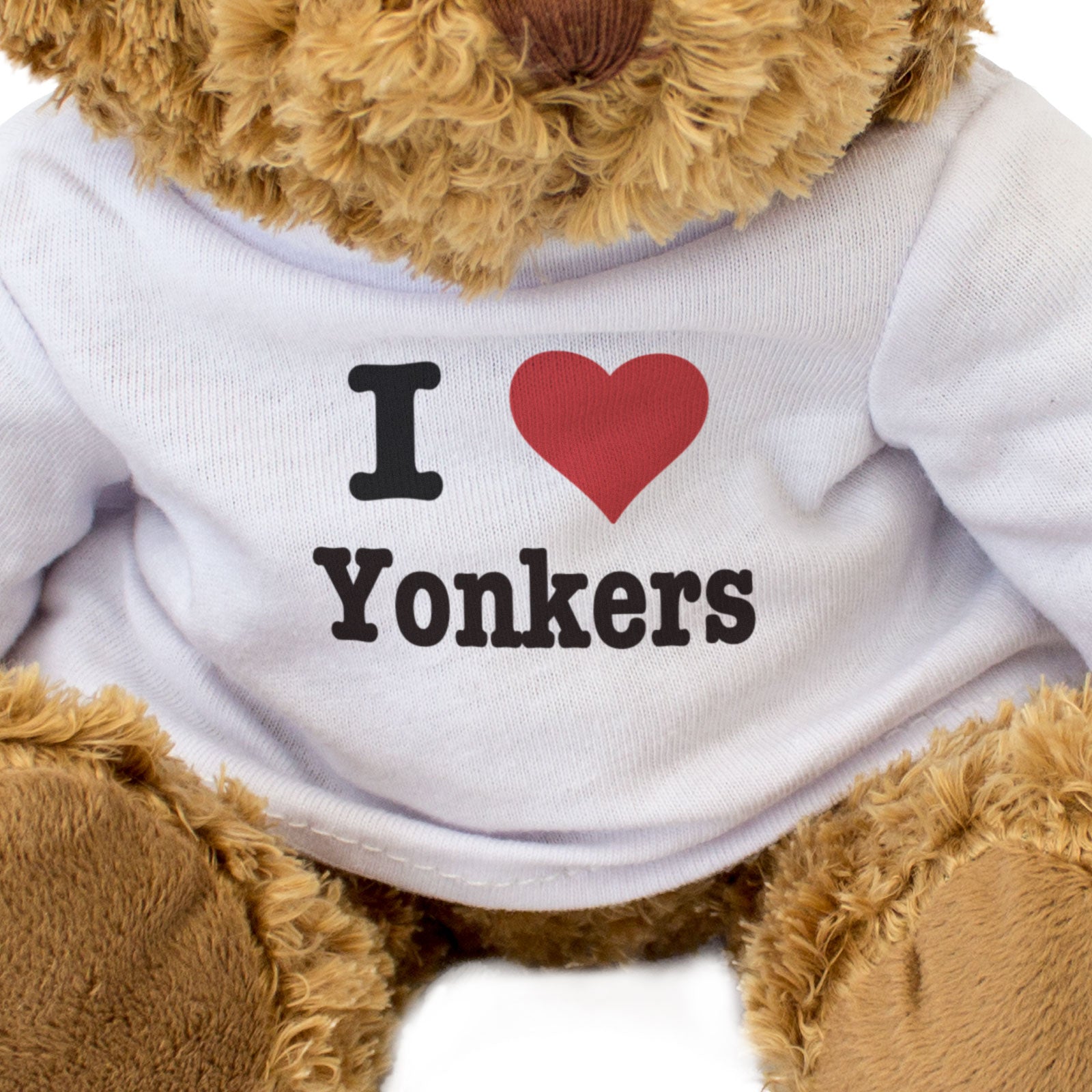 Our bear wears a white t-shirt with the I Love Yonkers printed on it in full colour. This teddy bear makes a thoughtful and personal gift for friends and family.