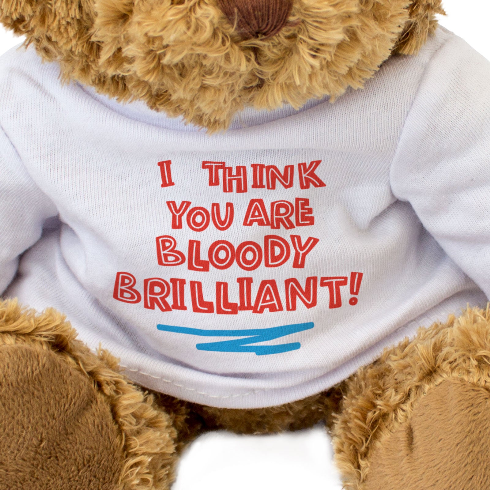 Our bear wears a white t-shirt with I Think You Are Bloody Brilliant printed on it in full colour. This bear makes a thoughtful and personal gift for friends and family.