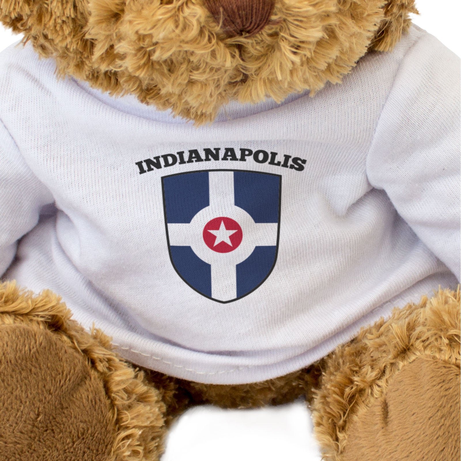 Our bear wears a white t-shirt with the flag of Indianapolis printed on it in full colour. This bear makes a thoughtful and personal gift for friends and family.