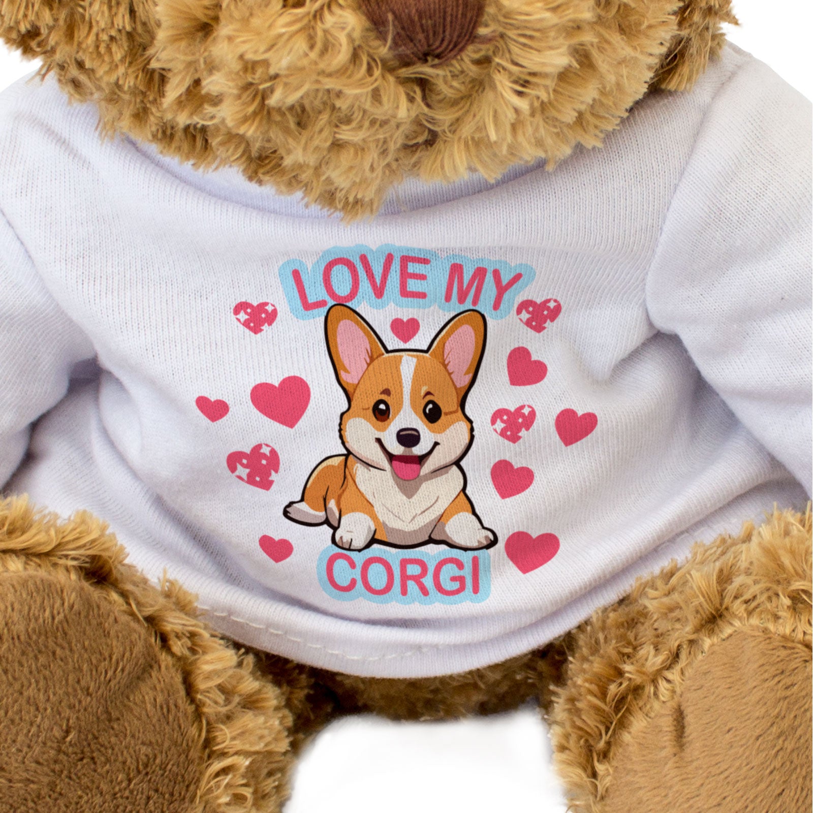 This teddy bear wears a white t-shirt with LOVE MY CORGI printed on it.