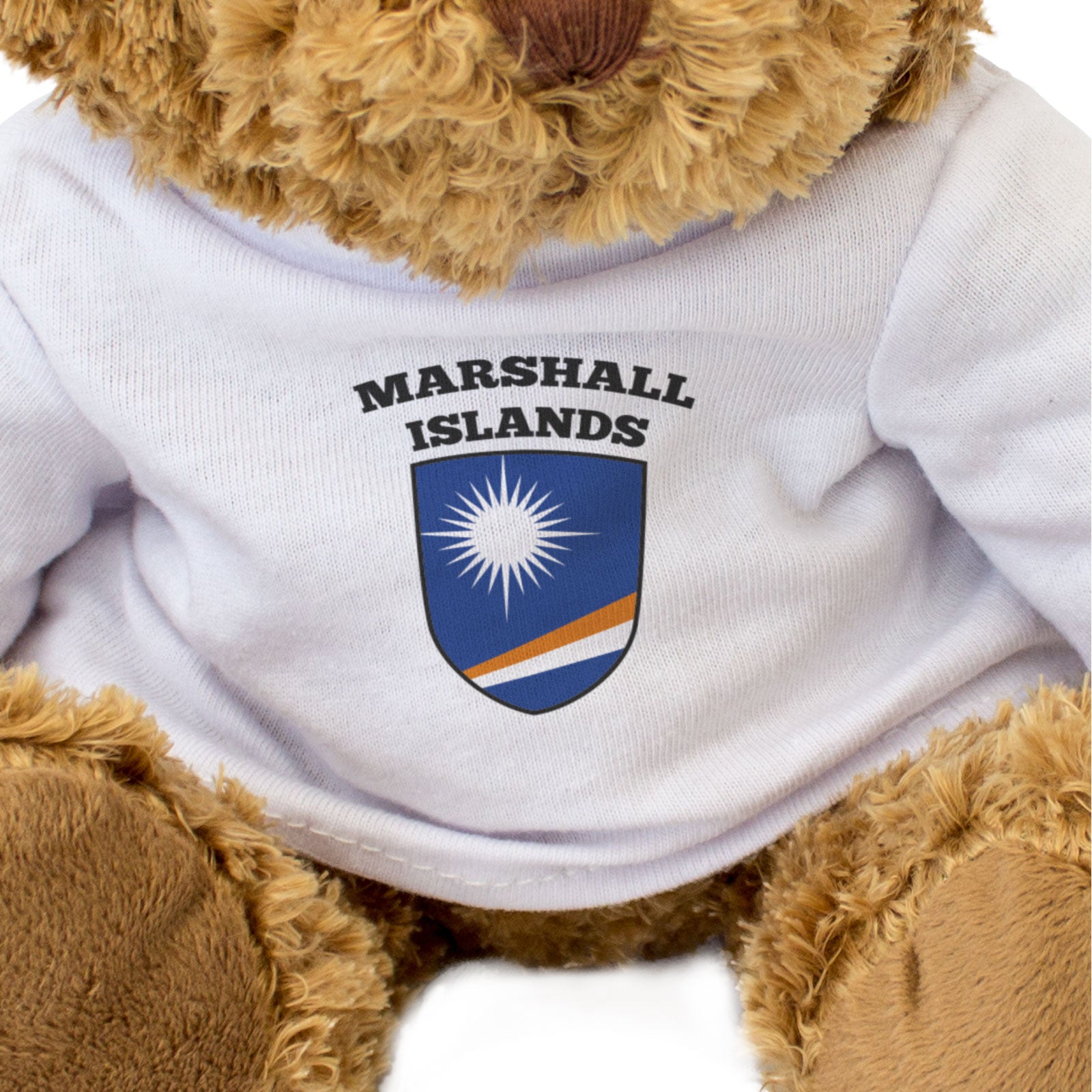 Our bear wears a white t-shirt with the flag of Marshall Islands printed on it in full colour. This bear makes a thoughtful and personal gift for friends and family.