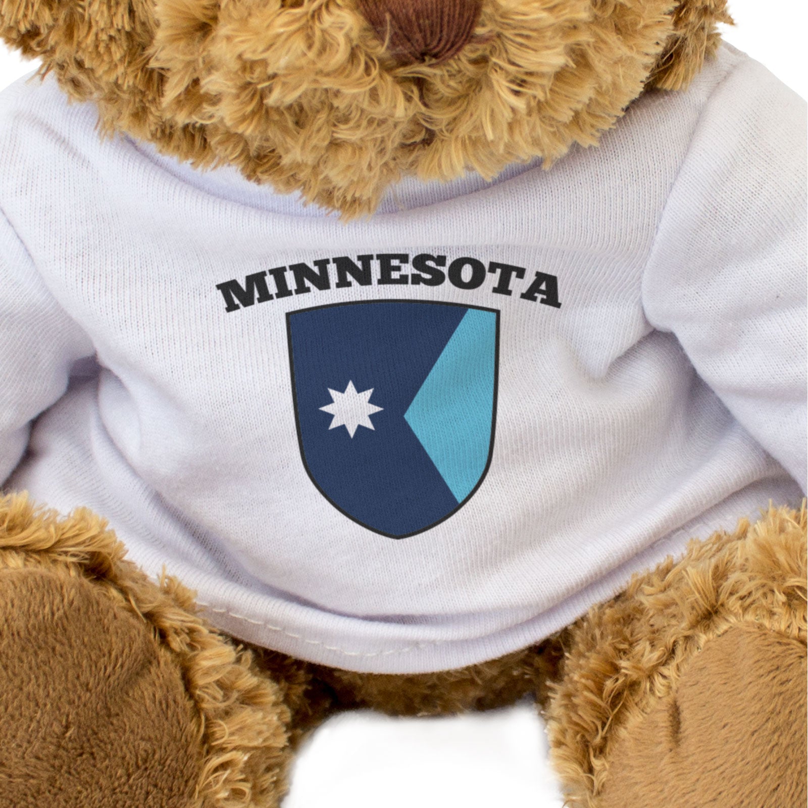 Our bear wears a white t-shirt with the flag of Minnesota printed on it in full colour. This bear makes a thoughtful and personal gift for friends and family.