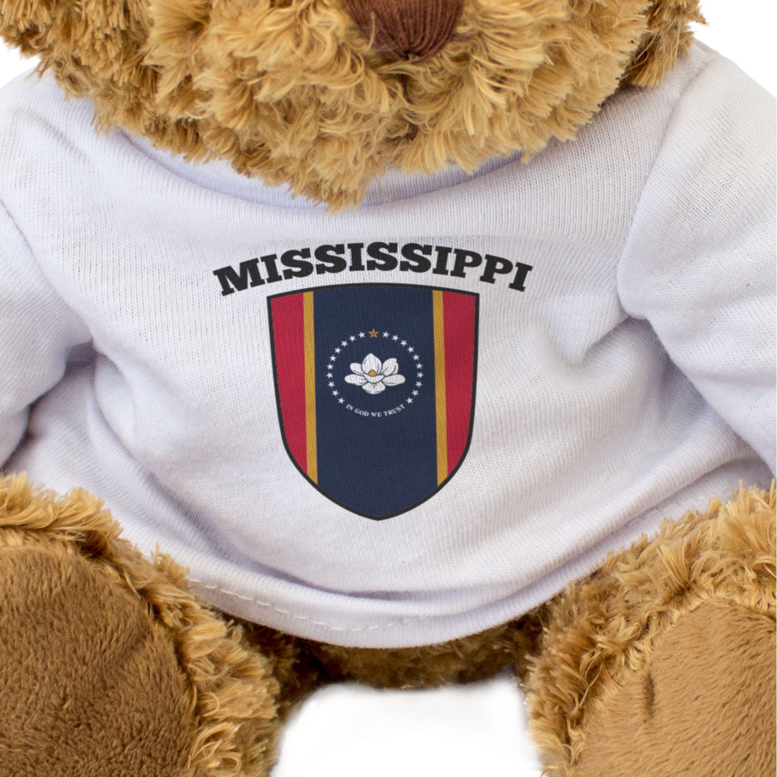 Our bear wears a white t-shirt with the flag of Mississippi printed on it in full colour. This bear makes a thoughtful and personal gift for friends and family.