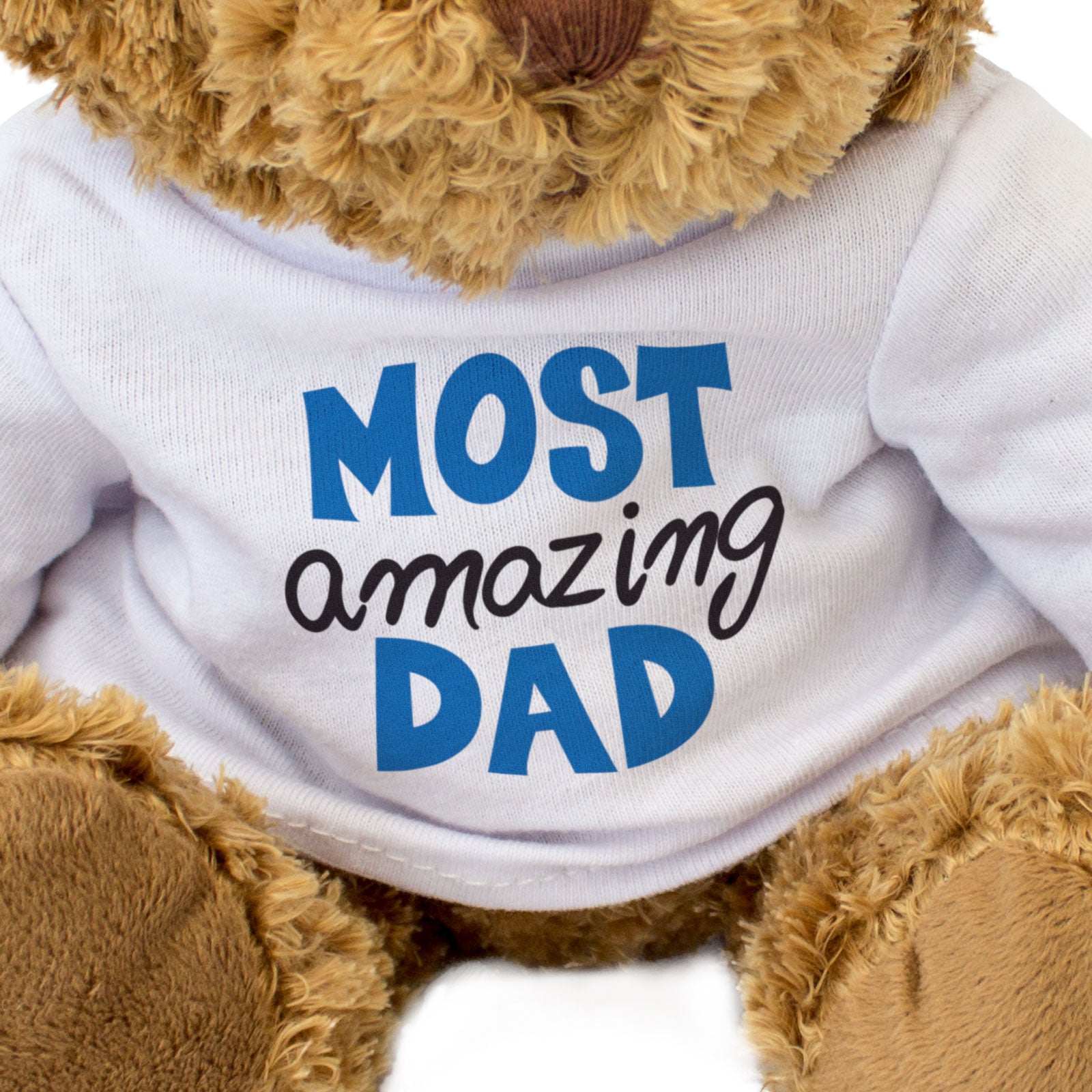 Our bear wears a white t-shirt with Most Amazing Dad printed on it in full colour. This bear makes a thoughtful and personal gift for family members and friends.