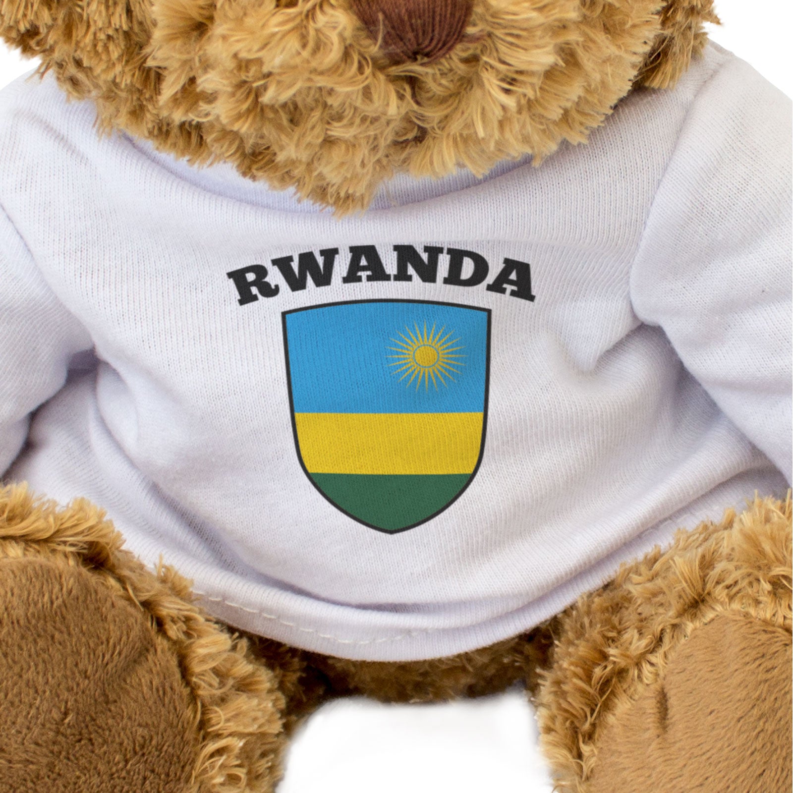 Our bear wears a white t-shirt with the flag of Rwanda printed on it in full colour. This bear makes a thoughtful and personal gift for friends and family.