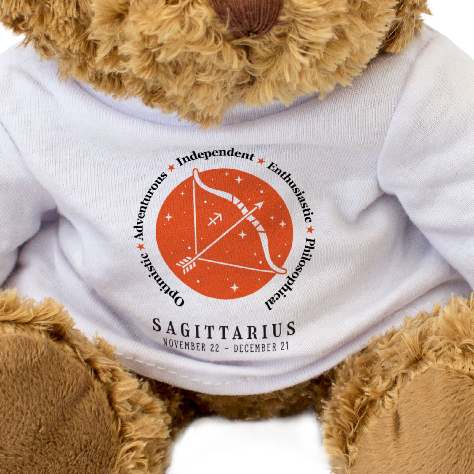 Our bear wears a white t-shirt with Sagittarius printed on it in full colour. This teddy bear makes a thoughtful and personal gift for friends and family.
