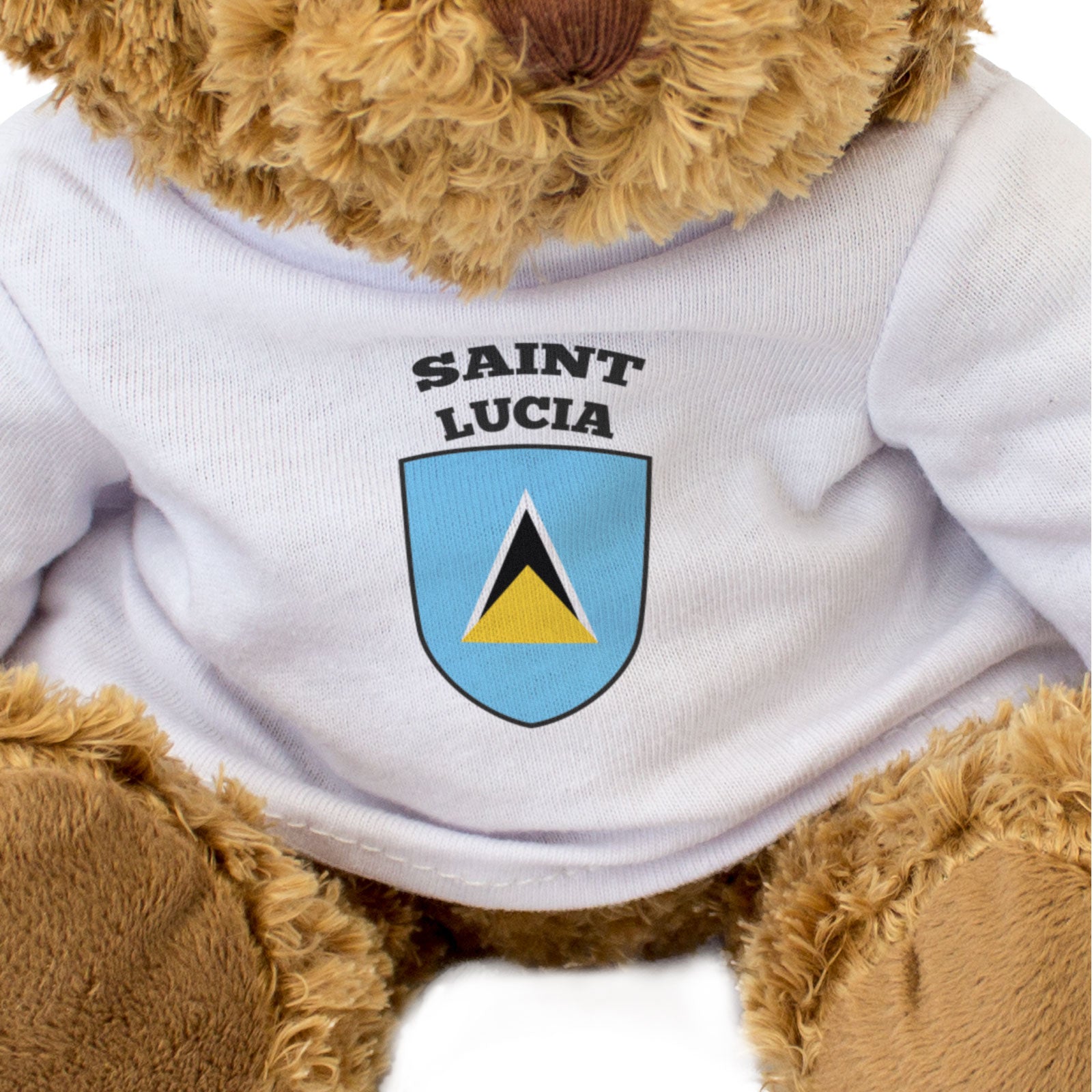 Our bear wears a white t-shirt with the flag of Saint Lucia printed on it in full colour. This bear makes a thoughtful and personal gift for friends and family.