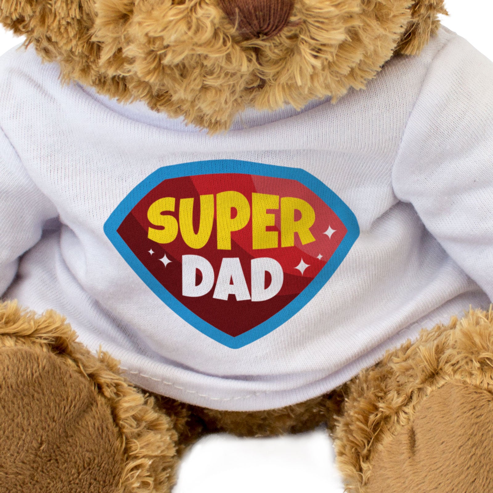 Our bear wears a white t-shirt with Super Dad printed on it in full colour. This bear makes a thoughtful and personal gift for family members and friends.