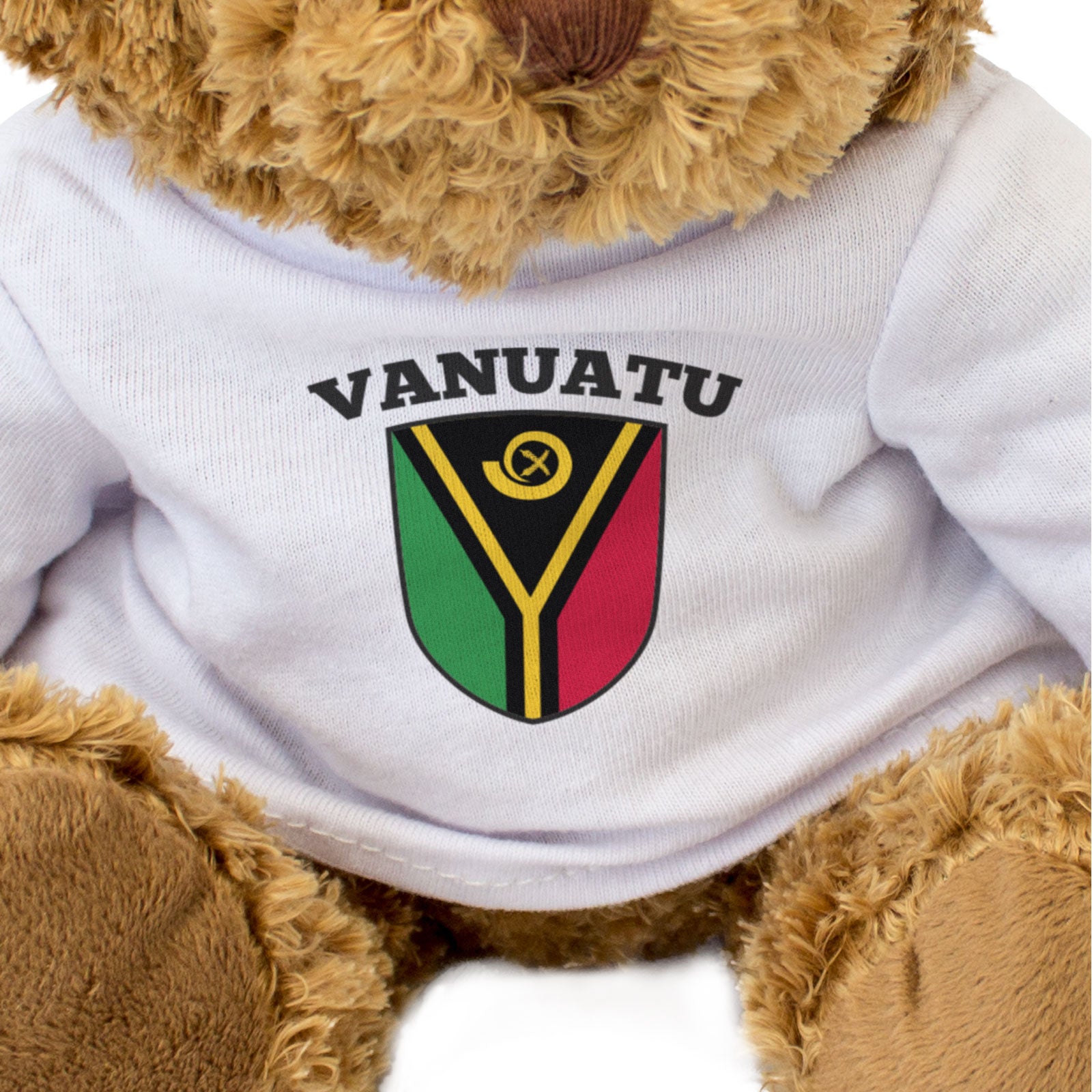 Our bear wears a white t-shirt with the flag of Vanuatu printed on it in full colour. This bear makes a thoughtful and personal gift for friends and family.